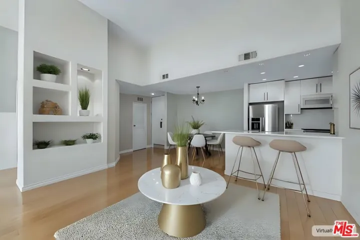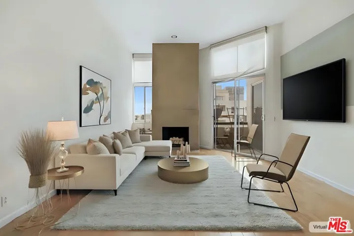 Penthouse living in Pico-Robertson! Step into a rare 1350 sf penthouse residence designed for comfort, style and ease. Located in a quiet, well kept building blocks from Beverly Hills, this top floor corner unit combines spacious luxury with unmatched convenience. Soaring 12 ft loft ceilings with dramatic windows for all day natural light. Expansive open plan living room with gas fireplace. Two balconies for indoor-outdoor living. Premium hardwood floors and stain resistant bedroom carpeting. Home theater projector and built-in screen for cinematic nights in.