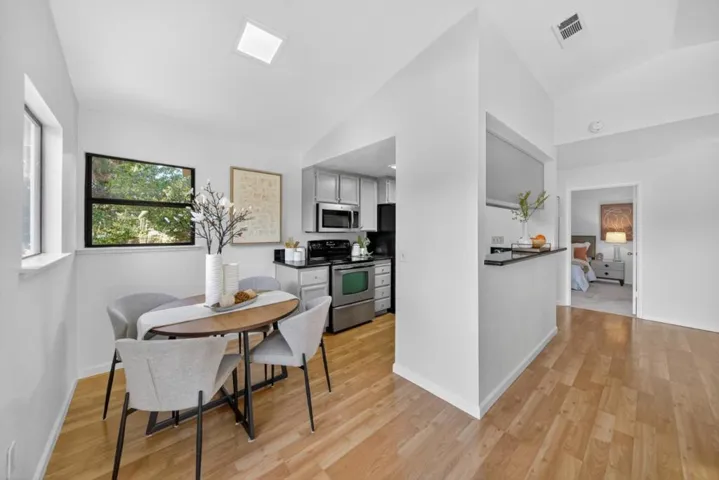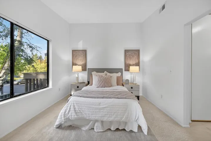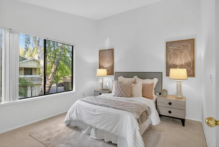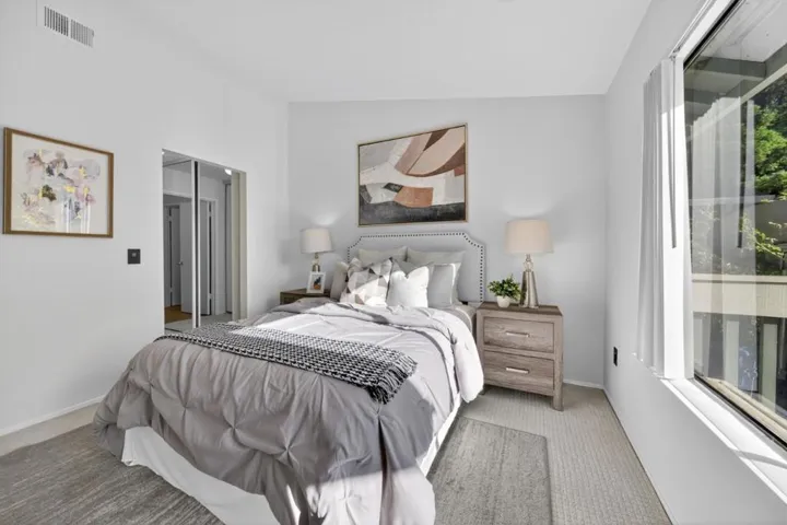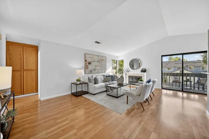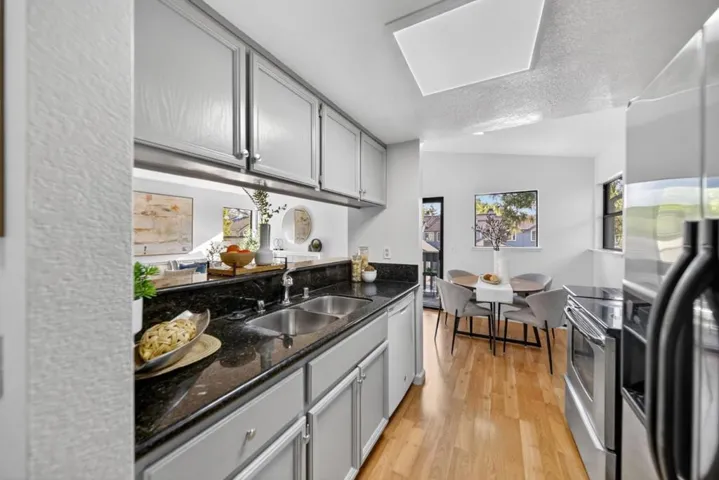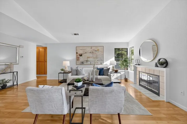 Welcome to a charming residence located in the thriving city of Fremont. This home, located in the upscale Ardenwood community, offers 2 bedrooms and 2 full bathrooms, with a total living space of 1,069 square feet. The kitchen is well-appointed with granite countertops, a dishwasher, garbage disposal, microwave, electric oven range, and refrigerator, making it a functional hub for culinary enthusiasts. Enjoy dining in the cozy eat-in kitchen area. The adjoining sliding door transports you to the outdoor patio for extra relaxation and entertainment space. The freshly-painted interior features a blend of modern carpet and laminate flooring, complemented by a vaulted ceiling that adds a sense of spaciousness. Cozy up by the fireplace in the living area, providing warmth and ambiance. The home also boasts central air conditioning and heating for year-round comfort. Laundry is conveniently located in the attached garage, which provides one parking space and extra storage shelving. An additional assigned outdoor space is also available. Additional amenities include access to a community pool. This property falls within the Fremont Unified School District. Experience comfortable living with all these amenities and features in this vibrant neighborhood.