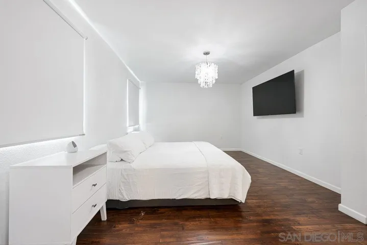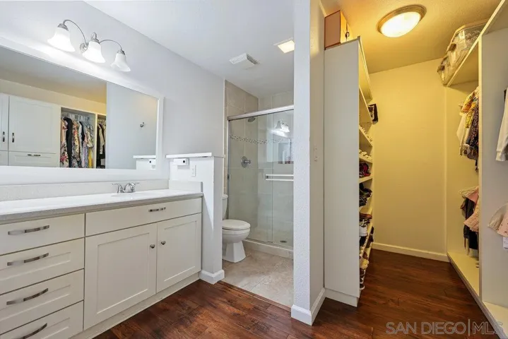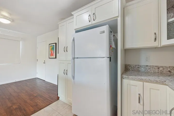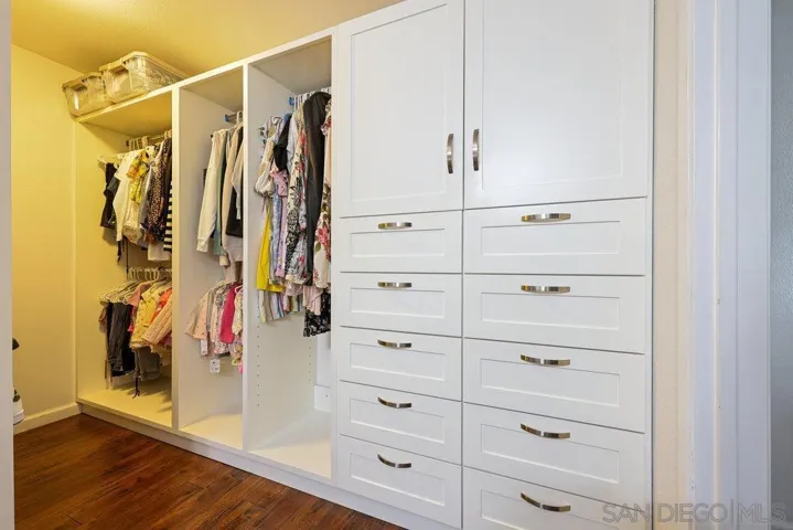 Welcome to this beautifully upgraded downstairs condo, offering 2 bedrooms and 2 bathrooms in a bright, open layout designed for both comfort and style. The kitchen shines with granite countertops, custom cabinetry, and ample workspace for everyday cooking or entertaining. The inviting living room is anchored by a cozy fireplace and flows seamlessly onto a private patio—perfect for morning coffee or evening relaxation. Inside, you’ll find rich laminate flooring, upgraded windows that fill the space with natural light, and a convenient in-unit laundry closet with a stacked washer and dryer. Both bathrooms have been fully remodeled with fresh, modern finishes that create a spa-like feel. The oversized primary suite is a true retreat, featuring a custom built-in wardrobe system with thoughtfully designed cabinets and drawers for maximum storage and organization. This home also includes a private attached garage with direct entry into the residence, plus TWO additional community parking spaces—an excellent combination of convenience and security. The community offers resort-style amenities, including a sparkling pool and a relaxing spa. The location is ideal: just off the 805 freeway, providing easy access to the highway, shopping, dining, and everyday conveniences. Move-in ready and thoughtfully updated, this condo perfectly blends comfort, convenience, and modern style—don’t miss the chance to make it yours!