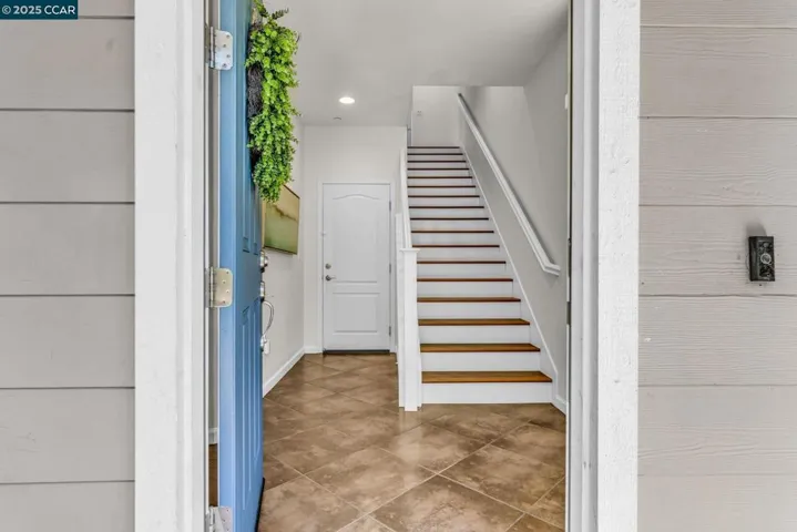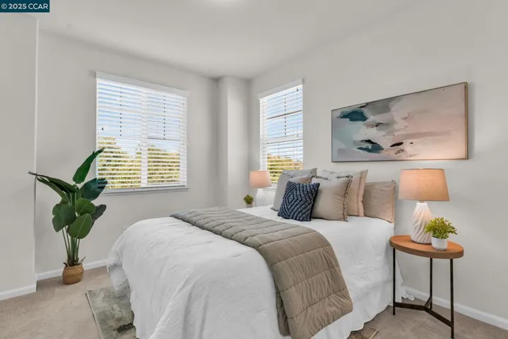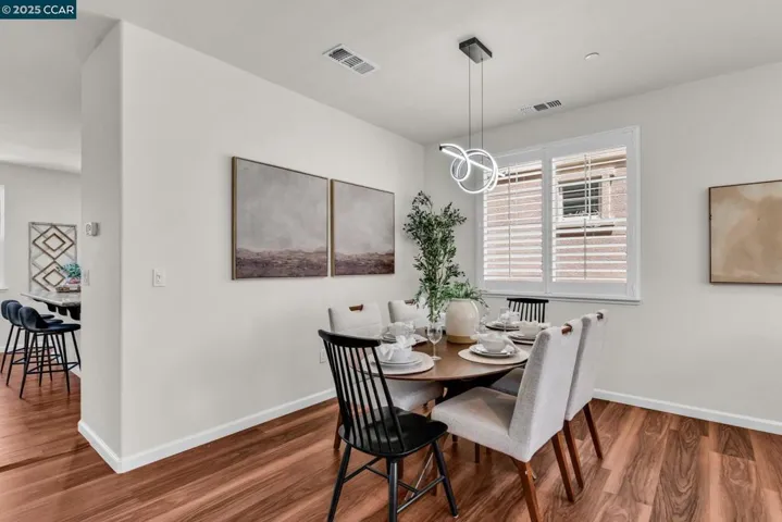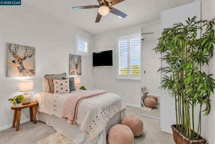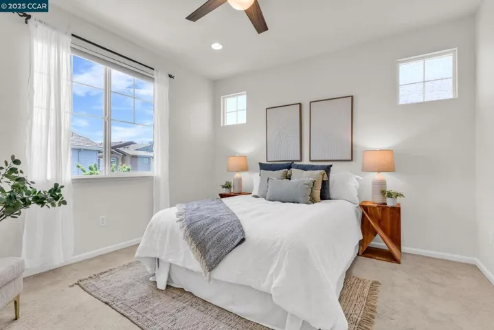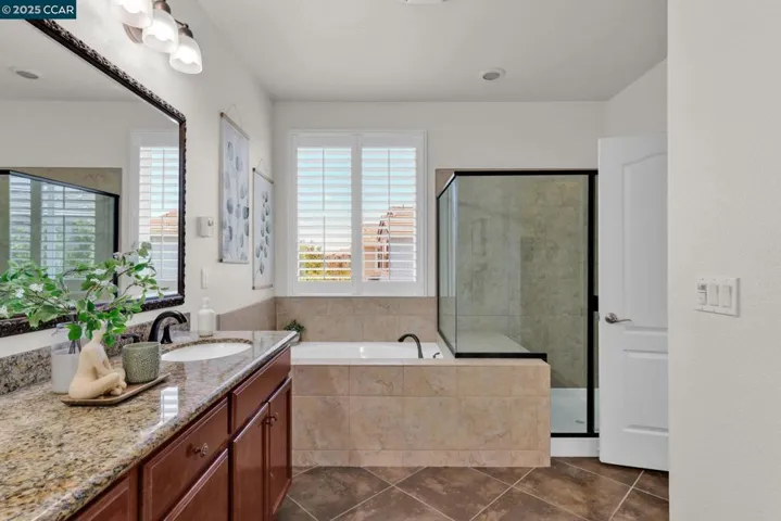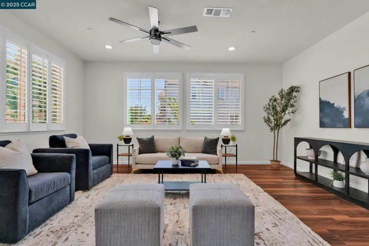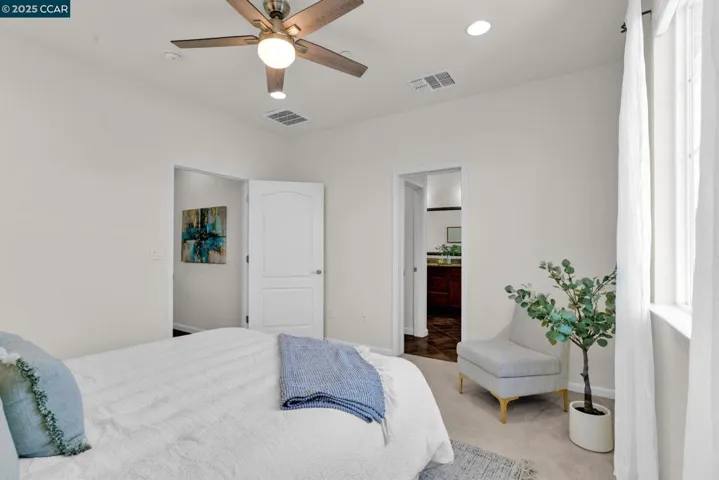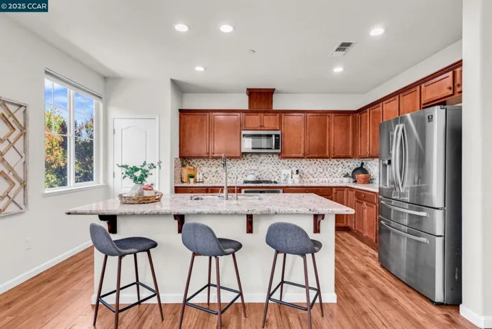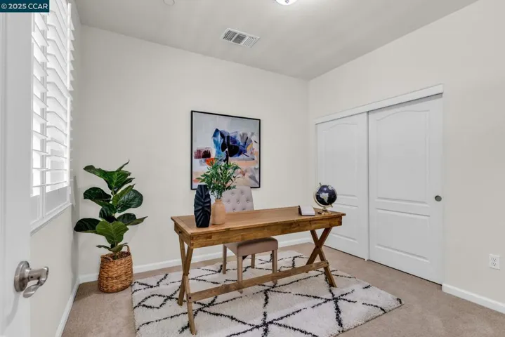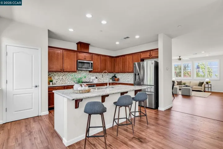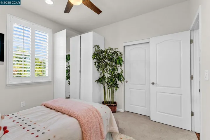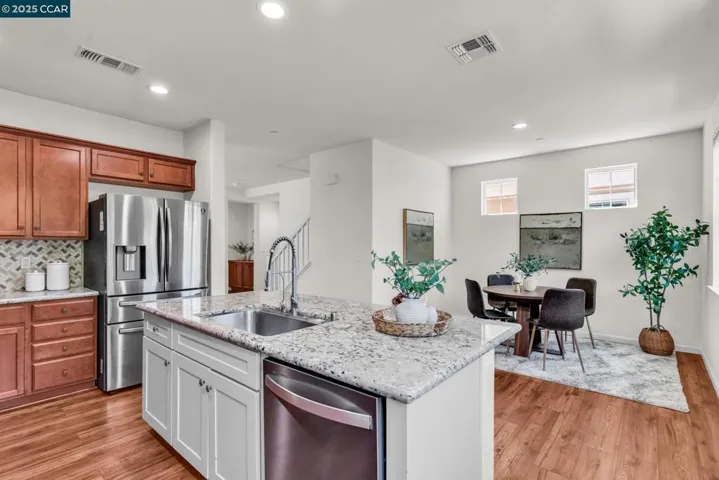 Beautiful Emerald Vista single family home in prime location! Sit on your porch and look at the scenic views of Alamo Creek trail with views of hills. No Mello Roos! Bedroom and full bathroom on the first floor- perfect for guests or home office. The spacious light filled great room and dining room is perfect for entertaining guest recessed lighting, ceiling fan, multiple windows and beautiful LVP flooring. The gourmet kitchen has slab granite countertops with a mosaic tile backsplash, a large island with bar seating, stainless steel appliances including a gas cooktop and built-in oven, pantry & plenty of cabinets. There is a large breakfast nook or could be a nice sitting or play area. The primary suite features a ceiling fan, spacious spa-like bathroom with double sink vanity with granite counter tops, large soaking tub, shower with glass enclosure and large walk-in closet with built-ins. Two secondary bedrooms with views of hills! Finished garage, owned solar, EV charger, smart HVAC and WIFI installed in garage. Step outside and connect with nature, take a leisure walk on the trail, or go for a hike. Minutes to freeway access, shopping, Target, Safeway & BART! Lots of guest parking at N Mariposa Ct, guest can park & take very short walk on trail to the house. OH Sat 2-4pm