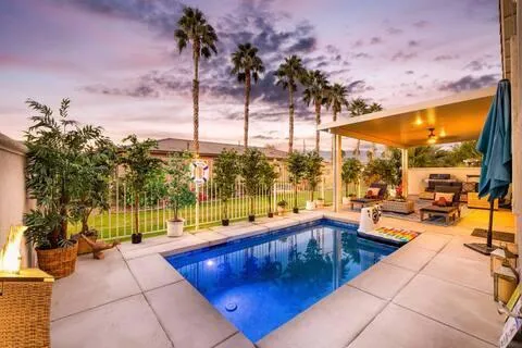 Honey stop the car! This custom designed 7 bed LAKEFRONT home in the beautiful Indian Palms community is waiting for you! Half a mile to shops, groceries and dining, but you won’t want to leave! The open kitchen boasts sleek granite countertops and plenty of space for meal preparation against the backdrop of the pristine fountain. Throughout the home, you’ll find brand new Pergo flooring, adding both style and durability for you and your whole family to make lasting memories. Sports and game lovers will appreciate the private golf putting green, croquet, sandbox for kids and HUGE game room w/air hockey, billiards, skee ball +. Step outside to your own private oasis, featuring new pebbletech pool/jacuzzi and big tanning shelf perfect for desert vibes. The backyard is unique, backing onto a picturesque pond and gated. It’s kid friendly, creating a serene enchanting atmosphere. Two brand new patio covers, in both the back and side yard, provide ample shade and comfort for outdoor lounging or entertaining. Sought-after Indian Palms community has access to top-notch amenities including 3 community swimming pools, 3 pristine golf courses, tennis, bocce ball, and a well-equipped gym. This home offers the perfect blend of comfort, style and resort-like living. Don’t miss this incredible experience! STR Permit #051548. Rates subject to change based on season, et al. Info provided deemed reliable but interested parties must verify all related to square footage, utilities, etc