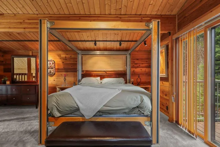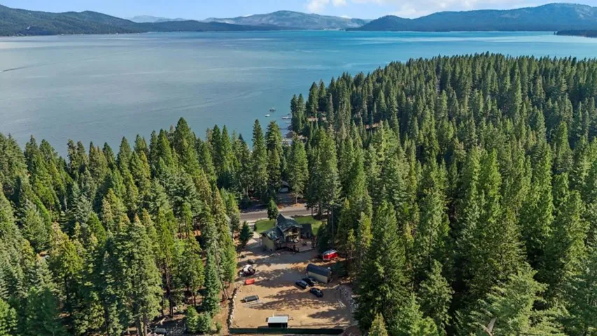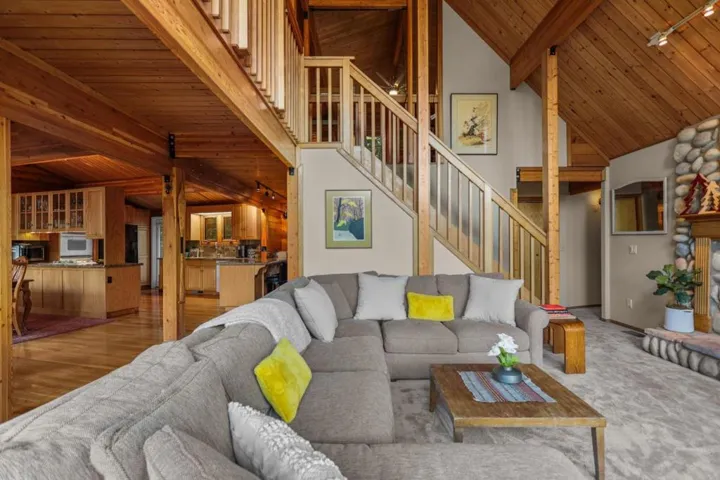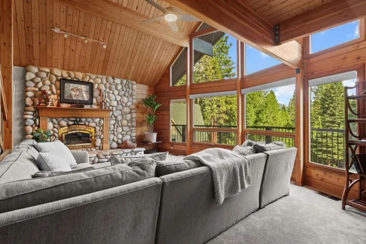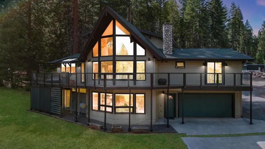 A stunning, entertainer’s delight with peek-a-boo views of the lake: 4 bedroom, 3 bath custom Lindal cedar home in Lake Almanor Country Club Estates. A spacious open beam, open concept layout with oak hardwood floors in the main living area. Cozy up to a warm fire in the stone fireplace in the living room with floor-to-ceiling windows. Chef’s kitchen features granite countertops, a gas stovetop, and a breakfast bar. The dining area is perfect for hosting large sit-down dinners and under bright atrium windows. On the other side is a family room and laundry/mud room. An expansive,984 sf, composite deck off the kitchen and family room and is level with parking area for convenient unloading of groceries. The 500 sf deck in the front of the house ends with a whimsical spiral staircase to access the outdoor space below. Primary loft suite retreat includes a private balcony deck, 2 bedrooms on the main floor, plus a ground-floor ensuite bedroom with patio access, outdoor shower and a 4-person, barrel sauna for ultimate relaxation. Amenities: separate one-car garage building, a Generac generator with its own dedicated propane tank, and an EV hookup in the 2-car attached garage. Large level lot above house with possibilities – a family compound, add a guest house, workshop – up to you.