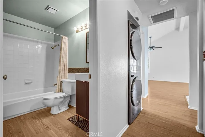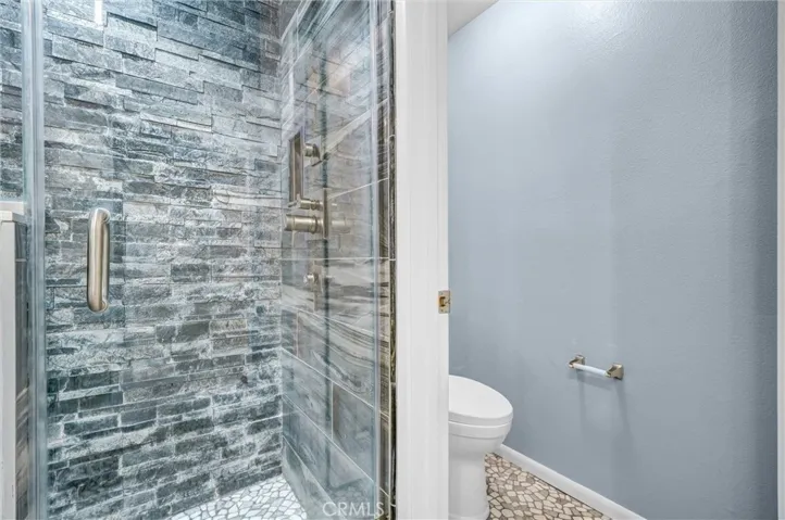 The kitchen is well-sized and functional with updated appliances and freshly painted cabinets, while the primary suite stands out with its spa-like bathroom featuring double sinks and a custom stone shower with multiple spray options. The second bedroom and bathroom are just down the hall, along with convenient indoor laundry.