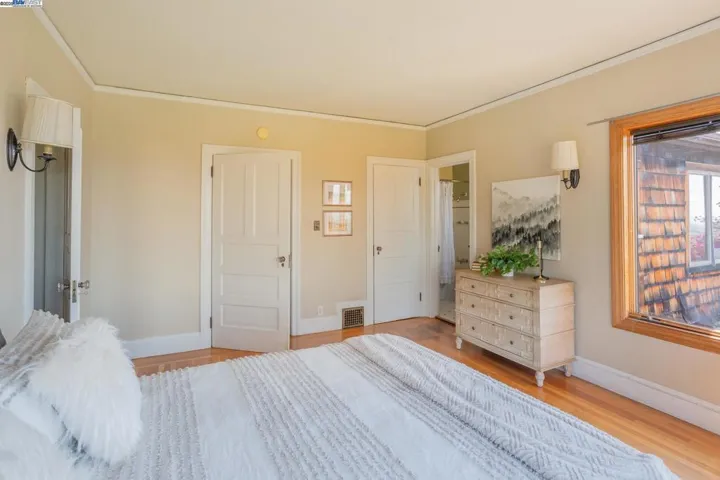 Built in 1926 for the Weeks Family and known as the Brown Shingle House. This charmer is on the List of Designated City Landmarks, Structures of Merit & Historic Districts. Views, Views, Views of the Golden Gate Bridge, Bay Bridge and Downtown SF! 4/4 on .33 acre approx. 2848 sf. Courtyard style entry and front yard to enjoy the spacious front yard area. Spacious living room with fireplace. Formal dining room overlooks the backyard. Eat-in kitchen with pantry and half bath and shower located nearby. Den/Library with fireplace and built in bookshelves open to what appears to have been the attached one car garage currently used as an exercise room. Two spacious bedrooms share bathroom with built in sconces on walls. One of the bedrooms has a covered balcony to enjoy the surroundings and views. Primary suite with covered veranda overlooks stunning views. Jr. suite has ample closet space and overlooks the backyard and views. Vast deck off the dining room, kitchen and foyer to watch sunsets and city lights. Detached 2 car garage. County records shows 3 baths but property has 4 baths. Short distance to Greek Theatre & UC Berkeley, Berkeley Rose Garden & Grizzly Peak Trail! Come make this 1925 home yours! Views: Downtown