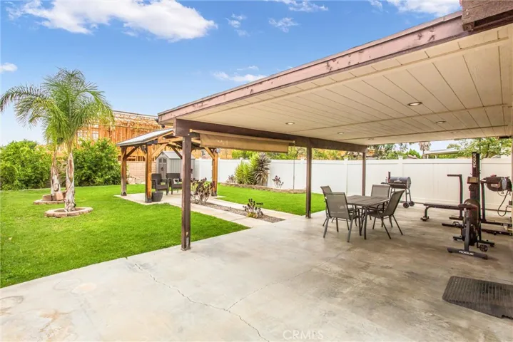 This beautifully maintained single-story home blends comfort, style, and functionality. The inviting curb appeal features a manicured lawn and mature palm trees. Inside you’ll find a bright and open living space highlighted by recessed lighting, wood-look flooring, and a cozy fireplace. The updated kitchen is a standout with crisp white cabinetry, stainless steel range, modern fixtures, and plenty of counter space. A spacious dining area that opens up to the living room, creating the perfect layout for entertaining. This home offers 2 bedrooms and 2 bathrooms, including a primary suite with ample closet space and a beautifully remodeled bathroom featuring a sleek tiled shower. The secondary bedroom is generously sized, with a ceiling fan and natural light. Step outside to the backyard retreat with a large covered patio, lush lawn, and custom wood gazebo, perfect for outdoor dining, entertaining, or simply relaxing. A dedicated laundry room, attached two-car garage add convenience and practicality. Located in an established neighborhood, this home is close to schools, parks, shopping, and freeway access for easy commuting.