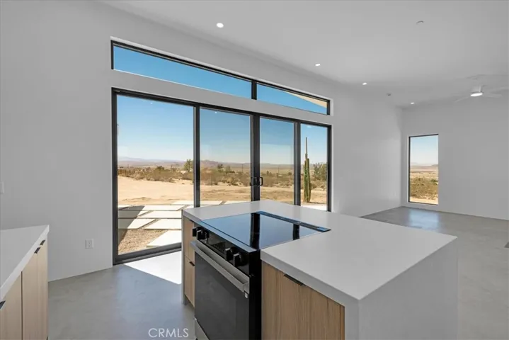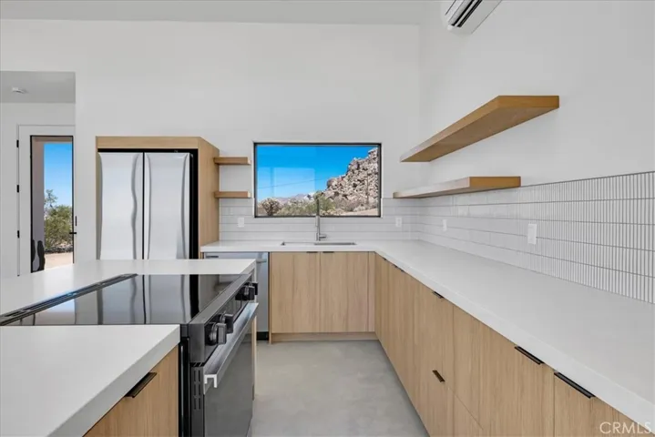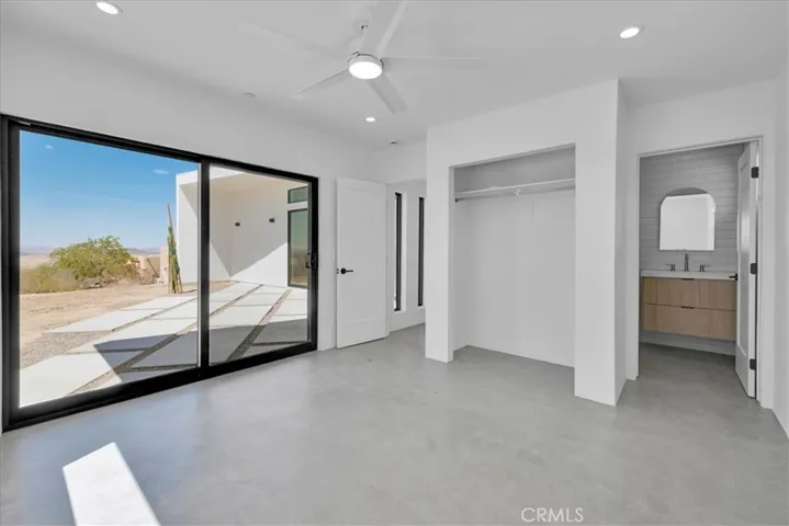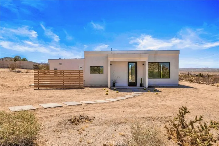 Spectacular New Construction Design & Location: Walking distance to Joshua Tree National Park – leave car at home and hike or jog into the vast wilderness only minutes away. In addition to the close proximity of nature, and only one parcel away, stands Joshua Tree’s most significant architectural jewel – The Kellogg Doolittle House, built into the boulders. Few local properties can boast such an iconic neighborhood structure and the freedom to roam at will on protected land. Sited at the base of a boulder mountain sits this beautifully designed home with a sunken living room, polished concrete floors, clean lines and numerous windows with stunning views in every direction. The kitchen features an island with double-waterfall quartz counters, subway tile backsplash and a window above the sink that perfectly frames the boulders above. Zoned ductless mini-splits allows for efficient cooling and heating. Floor-to-ceiling tile in the bathroom. Each bedroom has its own large sliding glass door for indoor/outdoor living. This is the second home the owners have built in prestigious Panorama Heights in South Joshua Tree. The first home is a high-grossing Airbnb that was featured in Architectural Digest, with a similar L-shaped design. However, this new property features a more spectacular and coveted location. Views to the west include SoCal’s tallest mountain – San Gorgonio – and sublime sunsets. No through traffic, as road ends only a few away near the National Park boundary. Also included are plans for a pool that are pending approval (for buyer to build at a later date if desired.) Whether looking for a primary residence or a vacation home investment, few properties share the qualities of this unique home and location.