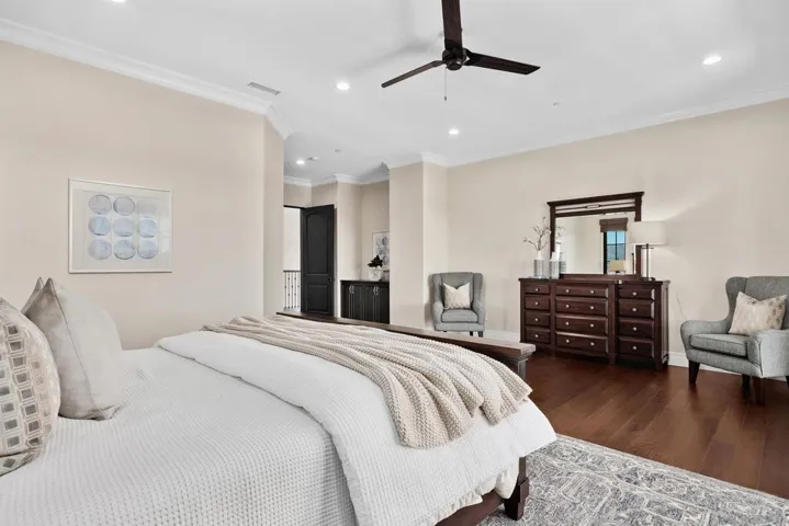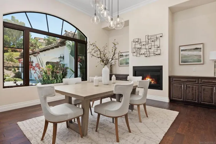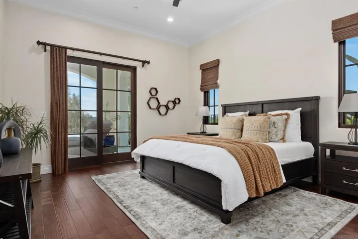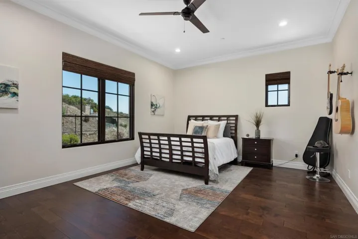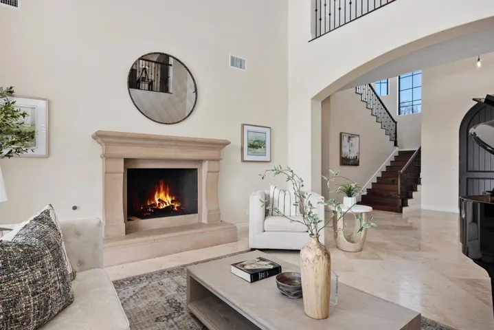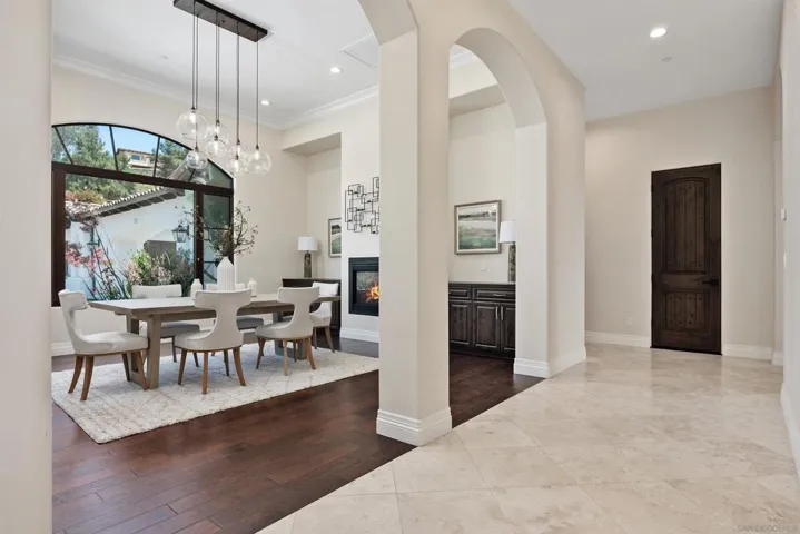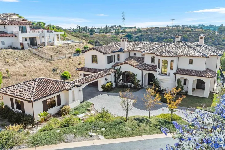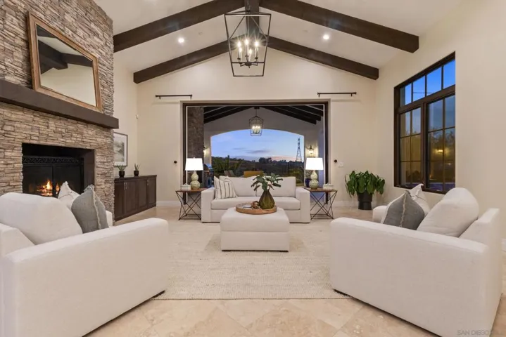This absolutely stunning custom estate in The Crosby at Rancho Santa Fe was completed in 2022, making it one of the newest homes in this prestigious community! Located within the top-rated Solana Santa Fe (K–8) and Torrey Pines High School districts, near premier private academies. Designed by renowned local architect Scott Grunst, the home is situated on a quiet, beautiful street lined with luxury residences. The 6,523 sq. ft. residence offers timeless elegance and modern luxury. A grand 22-ft foyer welcomes you with soaring arched windows, hardwood floors, exposed solid wood beams, and a dramatic staircase with wrought iron railings. The chef’s kitchen features an eight burner Wolf range with an infrared charbroiler, 64″ Electrolux fridge/freezer combo, and double Electrolux dishwashers, while the wet bar has a built-in kegerator. Wine lovers will appreciate the custom, temperature and humidity-controlled 800-bottle wine cellar with additional storage space. The house has Brazilian quartzite countertops and custom-built stained alder wood cabinetry throughout. Enjoy seamless indoor-outdoor living with disappearing pocket sliding doors that open the main living room to a covered loggia with full outdoor kitchen, fireplace, and Wolf BBQ. The resort-style backyard is very private and boasts a rim flow PebbleTec® coated pool, vanishing-edge spa, raised fire pits, and unobstructed sunset views over a protected natural preserve. The home includes an elegant executive office downstairs with built-in bookcases and a fireplace, a massive upstairs primary suite, and a main-level guest/primary suite—perfect for multigenerational living. Upstairs you will find two additional ensuite bedrooms and a game room on the landing above the living room. Additional highlights include an owned solar system, oversized motor court, and a four-car garage setup: attached two-car garage with Tesla charger and detached two-car garage with added insulation and A/C wiring for yoga, gym, or studio use. The community is a quick 5-minute drive to Rancho Santa Fe Village through the north gate, while the south gate provides easy access to Hwy 56, Hwy 15, and Hwy 5 for convenient commutes, shopping, dining, and beach trips. Residents enjoy amenities such as a Fred Couples-designed golf course, 35,000 sq. ft. clubhouse, tennis and pickleball courts, Olympic size pool, spa, fitness center, fine dining, and vibrant social events.