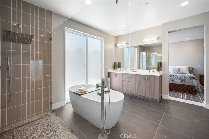 The primary suite offers a true retreat with a spa-level bath including a deep soaking tub, zero-threshold rain shower with private patio access, and a custom walk-in closet designed for functionality and elegance.