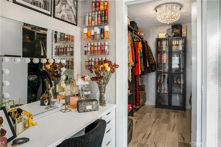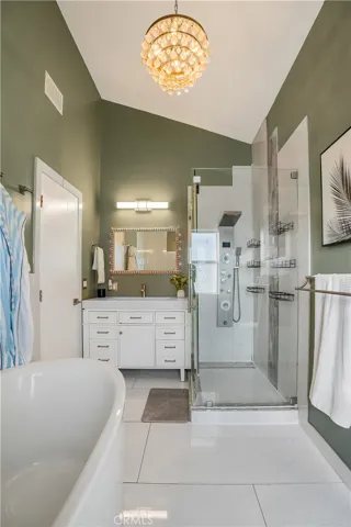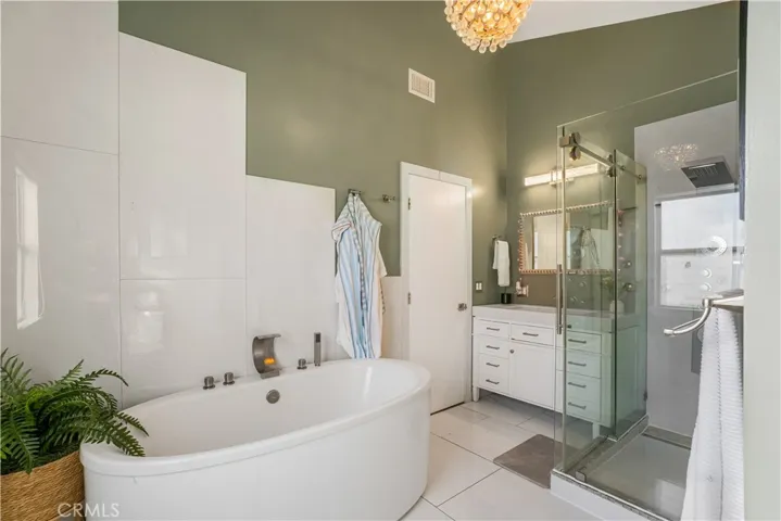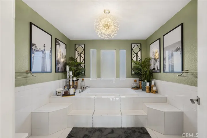 The grand entrance, framed by elegant columns, opens to a dramatic foyer with a crystal chandelier. The main-level primary suite showcases double entry doors, dual sinks, a marble soaking tub, a walk-in closet, and a unique vanity room with its own private side entrance.