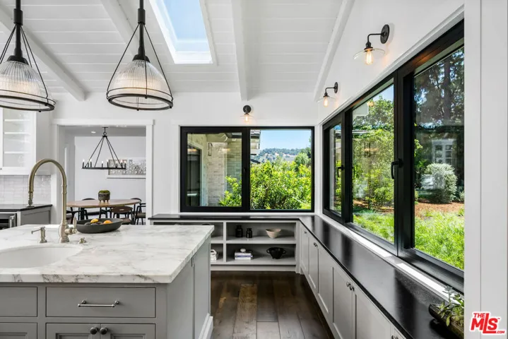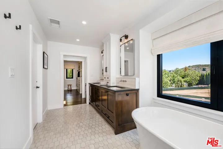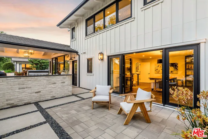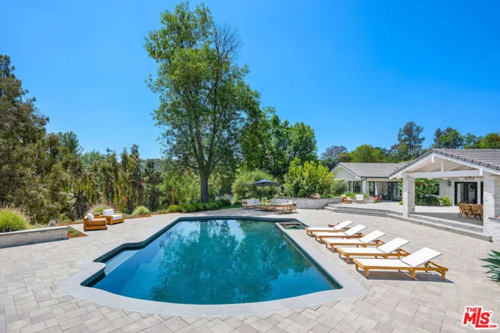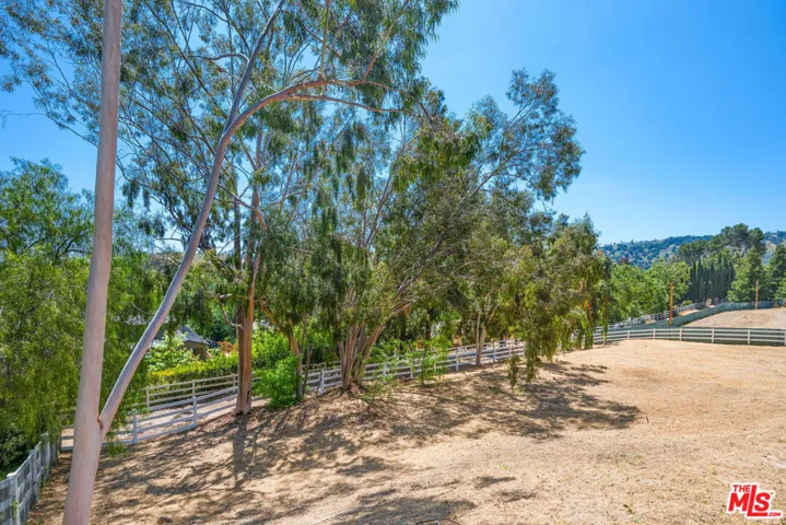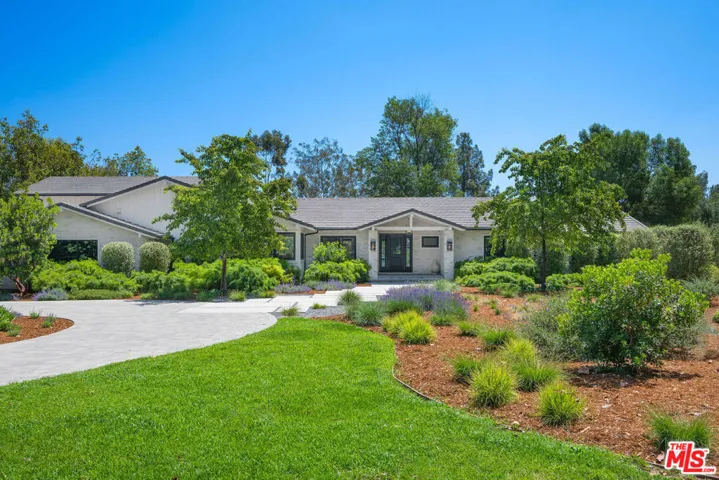 This quintessential Hidden Hills estate is like no other. An outlier in all of the best ways, this property has retained its 1960’s pedigree while offering all of today’s luxuries in an earthy, California palette. One of its many unique features is that it lives like a single story with only two of its six en-suite bedrooms on the second floor. Situated on one of Hidden Hills most sought after streets on a flat lot, this property ushers you in with its long circular driveway and beautiful native landscaping. Upon entering, you’ll notice the sophisticated materials used to transform this home into a sanctuary for everyday living and entertaining. Designed by Jessica Risko Smith to capture luxurious comfort as well as simplicity, this home offers understated elegance throughout. Featuring Oregon oak flooring, the elegant living room flows out to the yard through European tilt-turn doors. The spacious family room has gorgeous vaulted ceilings with skylights and leads out to a covered al fresco dining area. The spectacular kitchen also has vaulted ceilings and skylights as well as dual marble topped islands. The perimeter soapstone countertops and cabinetry are framed with European tilt-turn windows with views to the front. A walk-in pantry and high-end Miele and SubZero appliances elevate the space. Adjacent family and dining rooms offer seamless flow for entertaining. Three en-suite bedrooms with stunning baths as well as a stackable laundry closet lead to the main level primary suite. The primary suite features cathedral ceilings, dual walk-in closets and doors leading to the patio. The spa-like primary bath has curated details such as an oak dual vanity with center storage, marble flooring, soaking tub and large shower. Additional highlights include a 500 sq ft office/flex space which opens to the yard, a spacious mudroom with prep sink and full laundry, powder room and beautiful pool bath with shower. Two additional vaulted-ceiling bedrooms are located upstairs, each ideal as guest suites or additional primary suites. Outdoor living is just as impressive, with a Pebble Tec pool and spa, a built-in BBQ with soapstone counters, a covered patio, and beautifully landscaped grounds. The 1.25-acre lot also includes a flat area suitable for a barn, ADU, tennis court, or other structure. This home is both high-performance and highly comfortable. Every detail has been thoughtfully considered to support a lifestyle that is elevated, and beautifully in tune with its surroundings. Every system – from foundation to roof – were upgraded, creating a property that blends modern function with timeless design. All located in prestigious Hidden Hills with its top tier security, numerous community amenities, horseback riding arenas and trails, and Blue Ribbon schools.