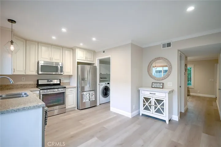 Appliances including refrigerator, washer, and dryer are included. Furniture, including a bed and large-screen TV, is negotiable.