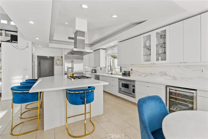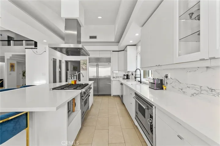 The chef’s kitchen is designed for gatherings, with a jumbo-size conversation island, integrated appliances, 22 ft quartz counters, sleek European cabinetry with pull-out drawers, stainless steel Viking commercial ovens and range, Sub-Zero refrigerator, oversized sinks, vegetable prep sink, and a large walk-in pantry. Outdoors, host in style at the custom kitchen with grill and 4-ft wall of fire centerpiece dining bar.