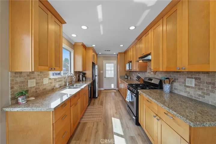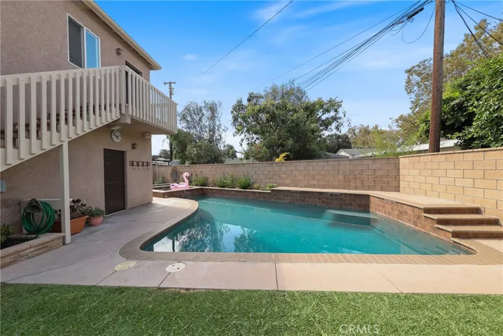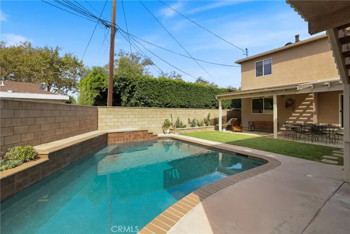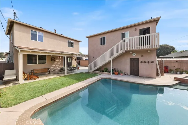 Discover warmth and comfort with this beautifully upgraded pool home in this highly desirable Lakewood neighborhood! With 5 bedrooms, 3.5 baths, 2,175 sqft PLUS a 504 sqft bonus room above the detached garage, all the needs for your family are fulfilled! The heart of the home lies in the freshly remodeled kitchen, featuring granite counters, travertine-stone-like tile backsplash, sleek solid wood shaker cabinets and recessed lighting. A thoughtfully opened layout creates an inviting atmosphere for both cooking and dining. The expansive family room boasts a cozy fireplace and has direct access into your backyard with the covered patio, pool and spa, which is perfect for gatherings. The downstairs primary bedroom comes complete with a large walk-in closet and bathroom. Additionally, there are two more bedrooms downstairs along with a full hall bathroom. Upstairs you will find two additional spacious bedrooms and another 3/4 bathroom. This home has 3 year new central air conditioning, 50 gallon water heater, dual pane windows and sliding glass door. $3000 flooring credit will be given :). Enjoy the tranquility of a heated saltwater PebbleTec pool and spa accented by custom hardscaping, including a waterfall feature, and with the added convenience of an outdoor shower. The covered patio and grassy area enhance the outdoor living experience with plenty of space to gather and entertain. The detached, extra-long, 2 car garage (28′ x 18′) houses the washer & dryer plus a half bathroom. The HUGE 28′ x 18′ bonus room above the garage offers so many options including an office, gym, or entertainment space. The home is situated close to schools, walking trails, Rynerson and Heartwell Parks, Heartwell Golf Course, Cerritos Mall and Long Beach Towne Center. Easy access to the 605 Freeway simplifies commuting. Don’t miss out on this amazing opportunity!