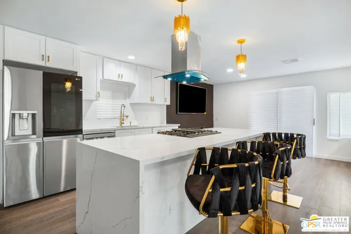 Come see this updated, newly painted inside and out, 1440 sq ft, 2bed/2bath home situated on the golf course with fabulous golf/mountain views. Property is located in one of the premier 55+ guard gated golf course communities in the valley with personal & social activities galore for the Active Adult. This home has so many NEW improvements exterior and interior which includes but is not limited to: new fencing leading to expansive and visually pleasing front door patio, desert and artificial grass landscaping with accented exterior lighting all around, your personal practice putting green (off the golf course patio) to work on the most serious part of your game or just to relax with some outdoor activity. There’s an outdoor stone top table to enjoy the views, sip your favorite cocktail/enjoy your favorite meal all while watching the duffers do their magic. Interior changes start with new front door, includes drywalling throughout, vinyl flooring throughout, double pane windows for energy savings, recessed lighting, designer fans, decorative fireplace, power outlets with USB/Type C receptacles. The kitchen features stone water counters, all new appliances (all internet connectable). The wet bar has even been updated with ‘live wood’ bar tops and a almost ceiling to floor wine cooler. The primary bedroom features a designer full wall closet. Both bathrooms feature floating vanities, new toilets. Primary bathroom has walk in shower while guest bathroom has jacuzzi tub. Laundry room features top of the line Washer/Dryer units. All furnishings, 3 mounted TVs, golf cart come with a full price offer, otherwise negotiable outside of escrow. A full price offer will also garner a $5,000 credit that can be used by buyers for first 3 months of rent space!! Date Palm CC has many other amenities besides golf which includes onsite restaurant, tennis/pickleball courts, a sports pavilion for billiards, ping-pong tables etc, satellite pools and spas, fitness rooms, large clubhouse with main pool/spa. Don’t let the space rent rate deter you. It is commensurate with what this park has to offer! over any like it in the valley. All this home really needs is… YOU!!