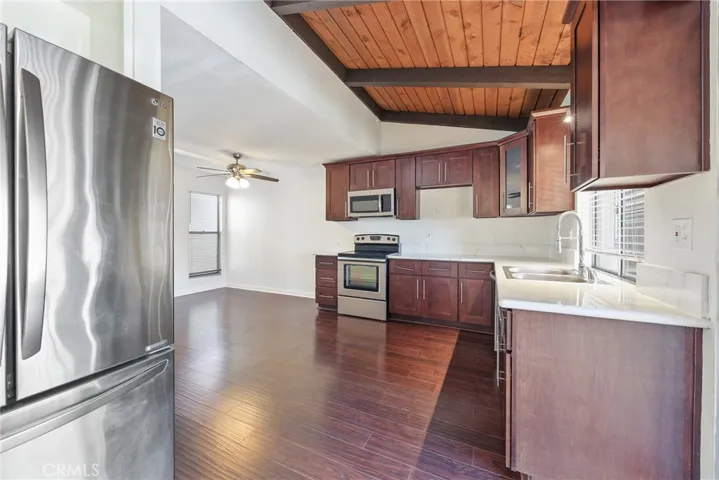 UPSTAIRS UNIT IN THE GATED COMMUNITY OF MACARTHUR VILLAGE! Enter the main level to the open floor plan. Wood flooring in the living and dining area and bedrooms. The kitchen is updated, stainless steel sink, stainless steel appliances, built-in microwave and a nice window looking out from the sink area, that opens to let natural light and air through. There is an outdoor balcony space. There are 2 bedrooms and 2 full baths. The bathrooms are upgraded as well. Includes one assigned carport space (#126). The community offers amenities including a pool, tennis courts, gym, clubhouse, BBQ areas and community laundry. Conveniently located near South Coast Plaza, with many shops, restaurants, entertainment, and more. Easy access to the 55 and 405 freeways and toll roads.