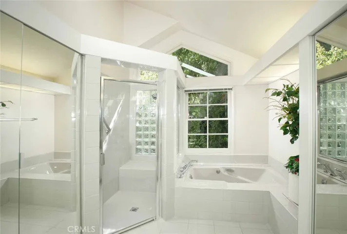 Upstairs, the luxurious primary suite feels like a private retreat with a fireplace, private balcony, built-ins, and extraordinary walk-in closets. The spa-inspired bath features skylights, dual vanities, a soaking tub, and glass-block shower. Additional bedrooms are generously sized, each with walk-in closets. The upstairs guest bedroom also enjoys private bath, vaulted ceilings and abundant natural light.