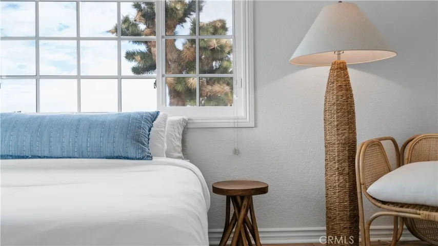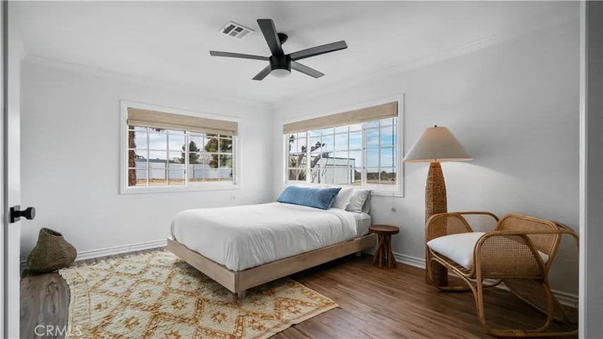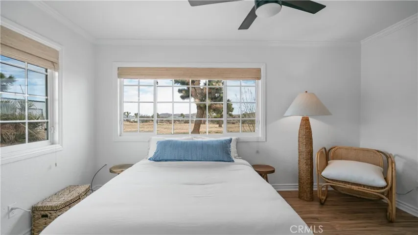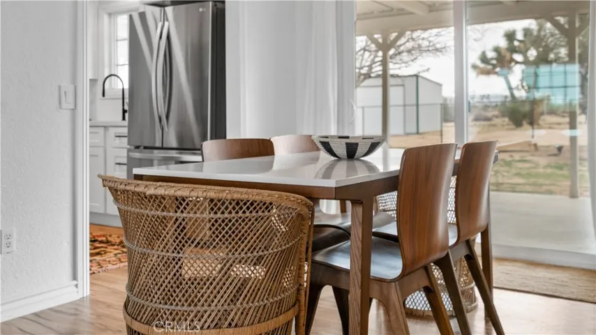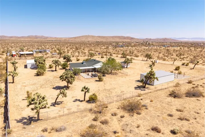 Sitting at the gateway where Yucca Valley meets Joshua Tree, this stunning fully furnished desert ranch home offers the perfect blend of rustic charm and modern upgrades. This 3 bedroom, 2 bath home spans 1,520 sq. ft. on over 2 acres of land, providing both privacy and plenty of space to enjoy the desert lifestyle. Step inside to a welcoming formal living room with new laminate flooring, crown molding, and a cozy wood-burning fireplace. The open-concept kitchen and family room showcase brand-new white shaker cabinets, stone countertops, upgraded stainless steel appliances, and a sliding door leading to a full-length covered back patio—ideal for indoor-outdoor living. Additional highlights include updated dual-pane windows, industrial farmhouse-style fixtures, and modern LED lighting throughout. Bedrooms feature plush new carpet with mirrored wardrobe doors, while the hallway offers a rustic barnwood farmhouse pantry and linen area. The primary suite boasts direct patio access along with an en suite bathroom featuring an updated vanity, fixtures, and tub/shower combo. Comfort is ensured with central HVAC and an evaporative cooler. Along with a 2-car attached garage, the property features two 4-car detached metal garages, offering a total of 10 covered parking spaces. These versatile spaces are perfect for car enthusiasts, off-road vehicle owners, workshops, studios, or creative retreats. Nearly the entire property is fenced with ample space for recreation and additional parking. A custom-built storage shed/playhouse and an abundance of Joshua Trees, Yucca Trees, and native desert landscaping add to the property’s charm.