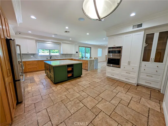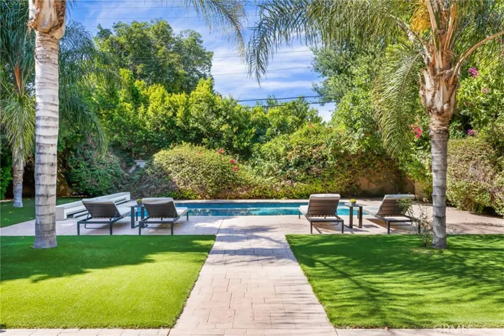 A dramatic double-height foyer with wrought iron accents and travertine floors sets the tone for the open, light-filled floor plan. Elegant formal living and dining rooms provide seamless flow for entertaining, while the spacious family room with fireplace opens through sliding glass doors to a lush, ultra-private backyard oasis. Outside, enjoy a sparkling pool, generous patio, and manicured grassy areas—perfect for both grand gatherings and intimate relaxation. The gourmet chef’s kitchen is a true centerpiece, featuring an oversized center island, stainless steel appliances, abundant cabinetry, and a sunlit breakfast nook. A versatile guest suite or home office with full bath completes the main level.