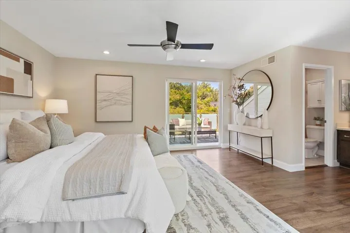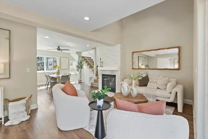 Welcome to this beautifully updated, light-filled 3 bedroom, 2 bath townhome in a well maintained community that combines comfort, convenience, & style. The flexible floorplan offers 2 bedrooms & a full bath on the first floor, 1 with sliding glass doors that open to a large private patio with direct access to the communitys greenbelt, perfect for indoor & outdoor living. Upstairs, the oversized primary suite is a true retreat, featuring laminate wood floors, a walk-in closet, & sliding doors to a sunny private balcony with treetop views. The main living area boasts a bright & open great room layout with a welcoming living room, fireplace, & sitting area. A separate dining space & another private balcony with lush garden views make entertaining a delight. The updated kitchen is designed for both style and function, complete with shaker style cabinets, a breakfast bar, stainless appliances, & a charming garden window. Additional highlights include a formal entry with wood laminate floors, abundant natural light throughout, & a huge attached two-car garage with custom storage cabinets. Located in a small, well-cared-for community close to shopping, parks, schools, & freeway access, this home truly shows pride of ownership and offers the perfect blend of relaxation and convenience.
