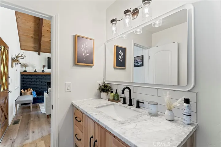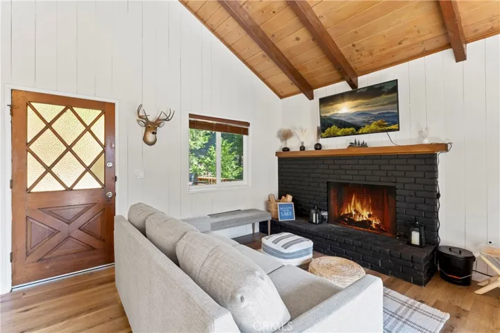 Nestled in the serene beauty of Lake Arrowhead, this enchanting 2 bedroom, 2 bath upgraded home invites you to unwind, reconnect, and savor the best of alpine living. Just minutes from the heart of Lake Arrowhead Village and the whimsical charm of Sky Park at Santa’s Village, this home blends mountain elegance with everyday comfort. Step inside to find a light-filled interior with rustic wood beam ceilings, an open-concept living area, and a stone-framed fireplace that sets the tone for cozy nights in. The fully appointed kitchen features modern appliances, updated cabinetry, and a breakfast bar perfect for morning coffee or evening wine. Both bedrooms offer peaceful forest views and thoughtful design, while the beautifully updated bathrooms boasts a soaking tub and shower with artisan tile work, creating a luxury experience. Outdoors offers a spacious forest view deck opening up to treetop vistas and breathtaking sunsets ideal for entertaining, grilling, or simply soaking in mother nature. Towering pines surround the property, offering privacy and a sense of seclusion, while still being close to shops, dining, and year round recreation. Whether you’re hosting friends around the fireplace, sipping cider beneath the stars, or enjoying morning hikes by the lake, this home is the perfect escape crafted for those who crave nature, comfort, and connection.