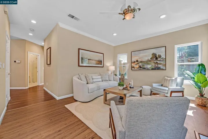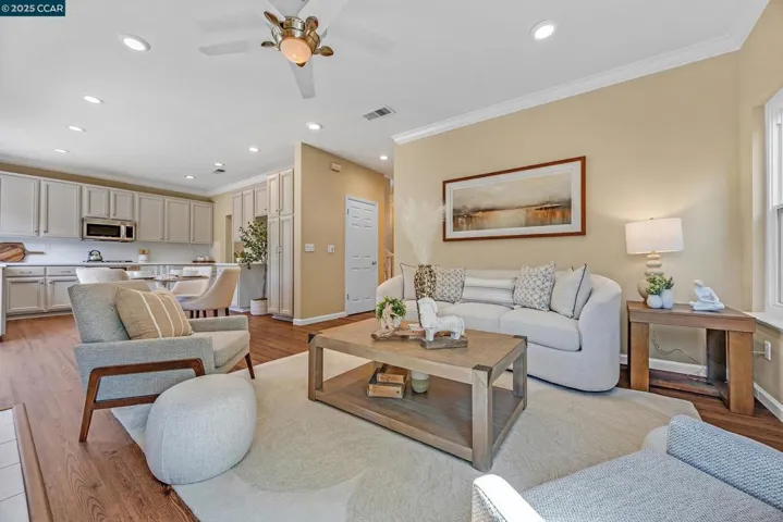 Beautifully situated in Danville’s sought-after East facing Tassajara Ranch, this home offers a bright and versatile floor plan close to top-rated schools, shops, and dining. Tall ceilings welcome you into the formal living and dining room combo, creating an open, airy feel. The updated kitchen features fresh countertops and paint, flowing seamlessly into the family room with views of the backyard. A main-level bedroom and full bath with stall shower provide ideal space for guests or in-laws. Upstairs, the spacious primary suite includes a walk-in closet, soaking tub, stall shower, and dual-sink vanity. Two additional bedrooms share a Jack & Jill bath with double vanity and shower over tub. The backyard is designed for both play and entertaining, with two large patio areas—one just outside the family room and another with a pergola—plus an artificial turf space. Enjoy access to community amenities including a pool, nearby Diablo Vista park which offers a playground and multiple sports fields and courts.
