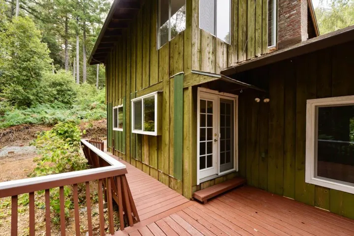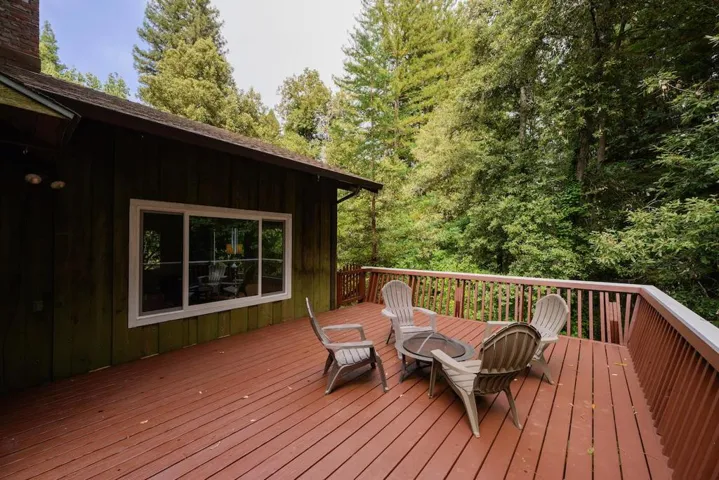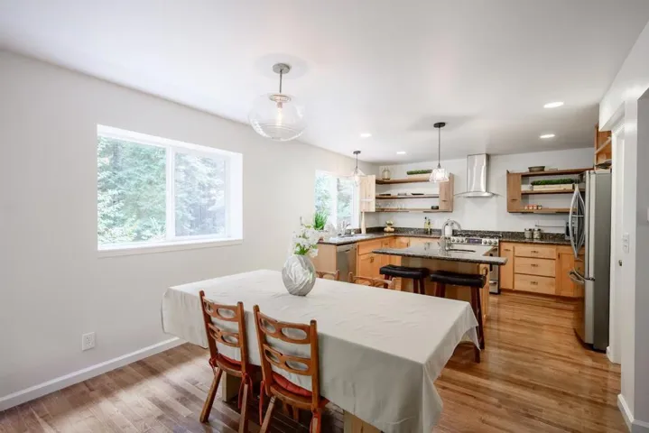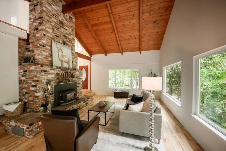 Nestled at the end of a quiet street, this beautifully remodeled home offers the best of both worlds, peaceful surroundings & close proximity to town. Situated on a nearly ¾ acre usable lot, the property provides endless possibilities for outdoor living. Inside, the thoughtful floor plan places the expansive primary suite on the main level, complete with a generous walk-in closet and private deck. 2 guest bedrooms & full bath are located upstairs, creating separation & privacy. The living room impresses w/ its dramatic wood-beam ceilings, hardwood floors, & a striking two-story brick fireplace that evokes the warmth of a Tahoe lodge. The kitchen is a chefs delight, featuring granite slab counters, island w/ sink & on-demand hot water, & abundant cabinetry. A spacious dining area offers serene forest views, w/ French doors leading to a large deck – perfect for entertaining in the fresh mountain air. Central heating & A/C, too! Outdoors, enjoy a sunny garden space, a roomy side yard ideal for a boat or RV, and plenty of usable land to make your own. The oversized garage provides excellent storage options, while recent upgrades include new carpet, new interior paint, & new water heater. This home combines modern updates, timeless charm, & a setting that feels like a private retreat.