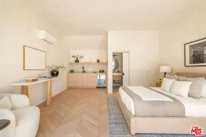 Tucked into the serene hills above the Sunset Strip by Chateau Marmont, this thoughtfully reimagined residence blends refined materials with modern livability. The interiors are wrapped in Portola limewash, lending warmth and depth to every space. At the heart of the living room, a custom travertine gas fireplace offers an understated focal point, balancing elegance with comfort. Generous outdoor spaces anchor each end of the home, with a south-facing lounge framing sweeping city views and inviting seamless indoor-outdoor living. The kitchen pairs solid oak cabinetry with Thermador appliances, anchored by striking leathered Taj Mahal stone countertops. The bathrooms are adorned with large-format porcelain slabs, along with custom integrated sinks and vanities. Underfoot, engineered European oak chevron floors bring a sense of rhythm and continuity throughout the home. The property is pre-wired for speakers in both the three-bedroom main house and the ADU. All this, only moments from the world class shopping and dining that West Hollywood and Beverly Hills have to offer.