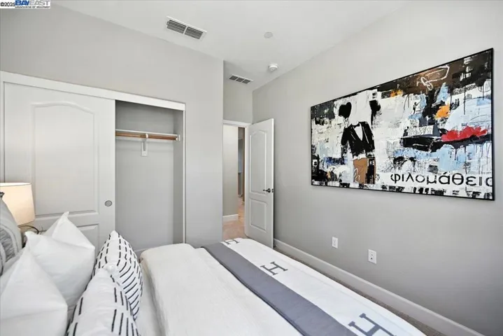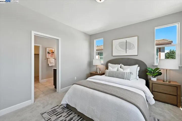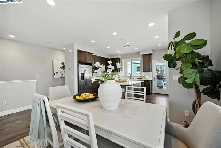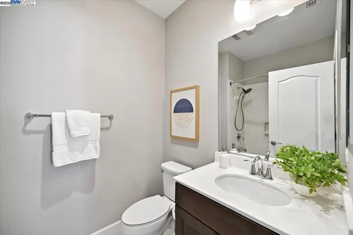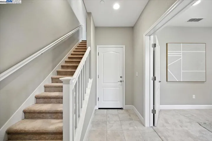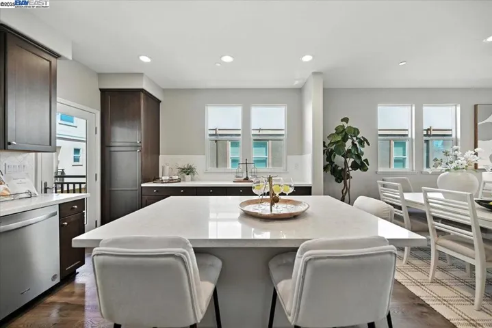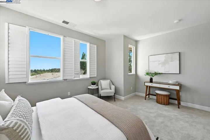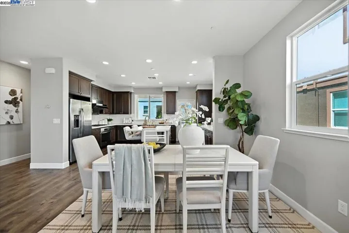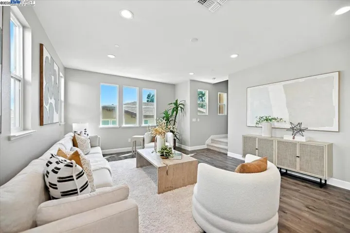 Welcome to 437 Ryan Terrace—an elegant tri-level corner townhome in the heart of San Ramon, a city celebrated for its top-rated schools, family-friendly vibe, and abundant parks. This spacious 3-bedroom + office, 3.5-bath residence blends comfort and functionality with designer finishes throughout. The gourmet kitchen boasts a large quartz island, gas cooktop, stainless steel appliances, and generous cabinetry. Enjoy luxury flooring in the main living areas, brand-new carpet in all bedrooms and hallways, and smart dual-zone climate control. Start your mornings on the private balcony, then retreat upstairs to a serene third level featuring a luxurious primary suite with dual vanities, a custom walk-in closet, and stunning mountain views. Two additional bedrooms share a full bath, while the laundry room offers custom built-ins. The versatile ground-level office (no closet) includes a full bath—ideal as a guest room, workspace, or media lounge. Additional highlights include a tankless water heater, EV charging outlet, and a 2-car side-by-side garage. All this in a quiet, kid-friendly community with easy access to I-680, shopping, and top schools—don’t miss this exceptional opportunity!
