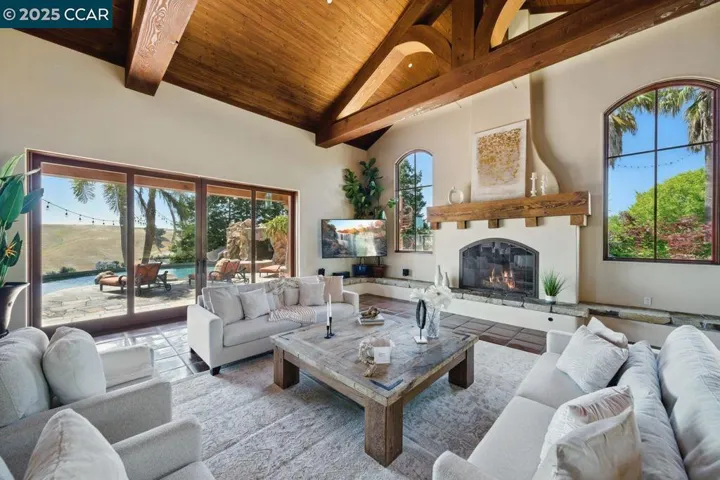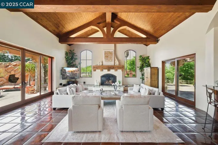 Situated in Danville atop a private hill on apx.11.6 sprawling acres, this exceptional custom estate offers a rare blend of refined luxury, architectural distinction & natural beauty. This is not just a home-it’s a rare opportunity to own a slice of Danville-for those who seek extraordinary! With apx. 5,843 sq ft, this residence is exquisitely designed w/vaulted ceilings w/wood-wrapped steel beams, expansive walls of glass flooding interiors w/natural light & frame sweeping views of the valley. From nearly every vantage point, enjoy awe-inspiring panoramas-rolling hills by day & sparkling lights by nite. The elevated position ensures both privacy & commanding presence, making it a true sanctuary above it all-create a family compound! The grounds encompass 30 palm trees, infinity pool & spa, BBQ w/built-in table. Multiple courtyards adorned w/3 tranquil fountains, along w/expansive paver entryways, create a seamless connection between indoor/outdoor living. From the moment you arrive, the gated property captivates w/its grand motorcourt & 6 car garage. Inside, the home is a showcase of craftsmanship w/a grand great room, gourmet kitchen, bar & aquarium. Owner’s suite w/walls of glass, fireplace, heated floors, sauna, skylight.Tesla Walls, Solar & Public Utilities! Great location!