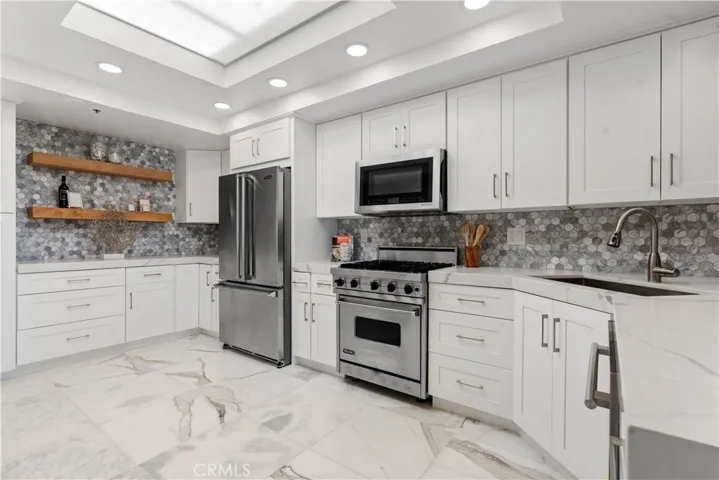 Remodeled with high-end Viking kitchen appliances, custom cabinetry, and luxury finishes. This condo’s numerous large windows and skylights make the use of artificial light unnecessary. Relax in the warmth of the living room fireplace. Take in the sights from the large, covered, wrap-around patio space with views of stunning sunsets over Catalina Island and the Pacific Ocean. Enjoy the association’s pools, spas, tennis courts, and gym. The assigned garage parking spaces, in-unit laundry, and elevator access are all included.