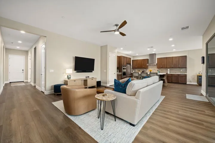 Experience resort-style living at its finest in the gated 55+ community of Trilogy Polo Club with this highly upgraded Proclaim model showcasing a solar lease system, 3 bedrooms plus den/office, 2.5 baths, and approximately 2,141 sq. ft. of beautifully designed living space. This residence features an open-concept floor plan filled with natural light, seamlessly blending indoor and outdoor living through expansive sliders that open to a covered paver patio, perfect for entertaining or relaxing against the backdrop of the Santa Rosa Mountains. The chef’s kitchen is a true showpiece with upgraded cabinetry, quartz countertops, stainless steel appliances, and an oversized island with seating, flowing effortlessly into the great room and dining area. The primary suite offers a spa-like retreat with a granite dual-sink vanity, chic tiled shower, and spacious walk-in closet, while two guest bedrooms share a stylish bath. Additional highlights include a powder room, golf cart garage, laundry room with a sink, luxury vinyl plank flooring, ceiling fans, custom California closets in the bedrooms and garage, solar, and numerous upgrades throughout. Residents of Trilogy Polo Club enjoy an exceptional array of amenities, including a modern clubhouse with a restaurant, fitness center, resort and lap pools, tennis, pickleball, golf simulator, poker/billiards room, culinary and art studios–all designed to elevate the desert lifestyle.
