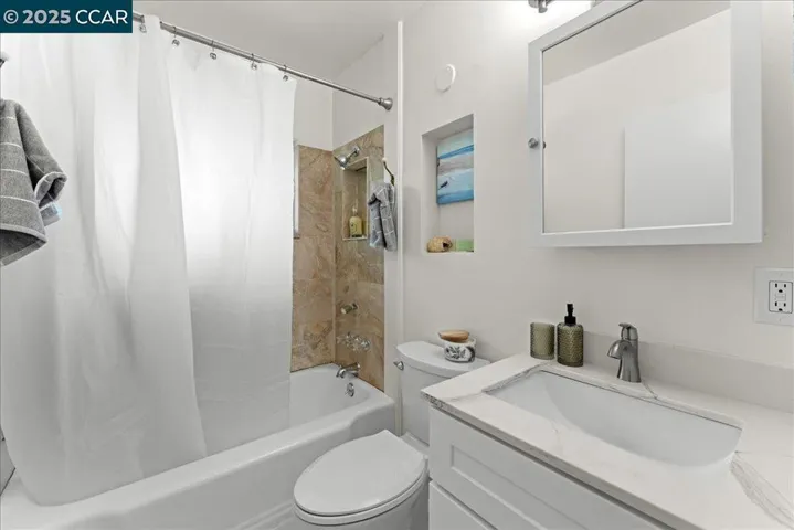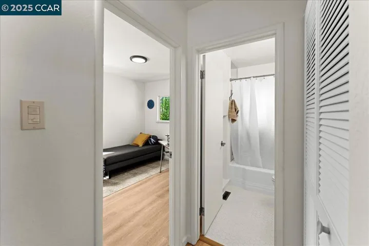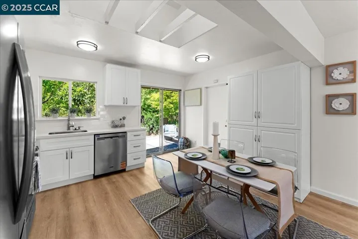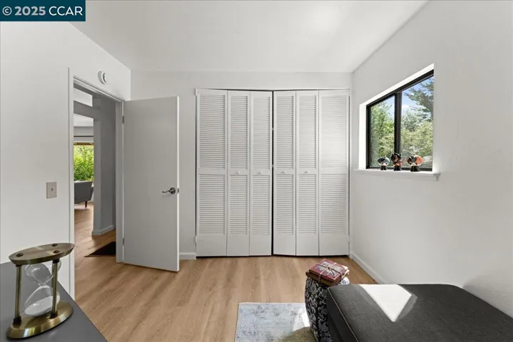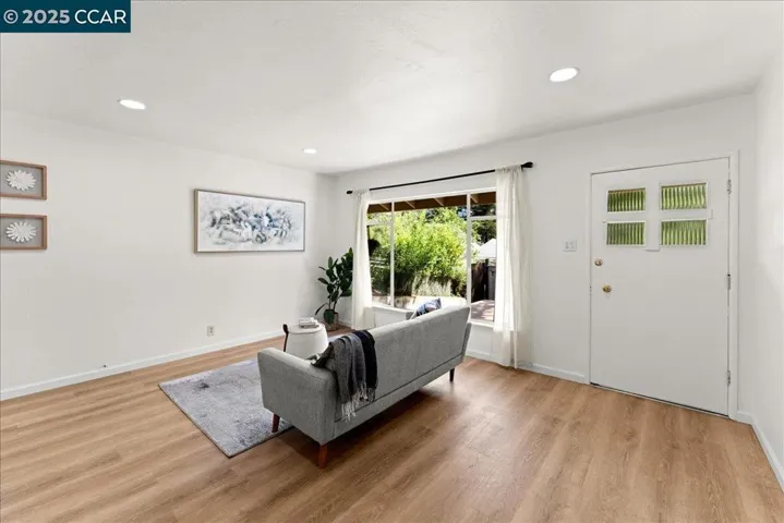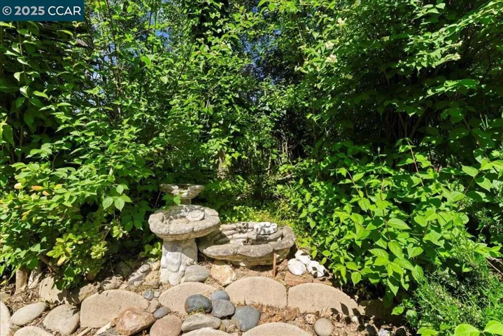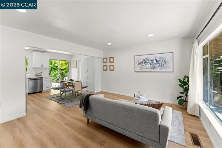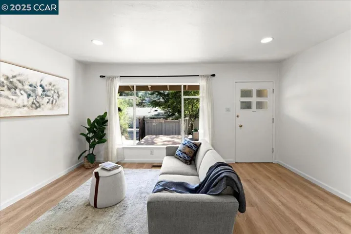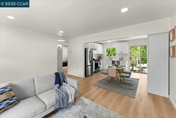 Welcome to your private bungalow retreat. This single-story, 2-bedroom, 1-bathroom upgraded home features new LVP flooring, fresh paint, and an updated bathroom. The eat-in kitchen is modern and ergonomic, with brand-new stainless steel appliances, custom cabinetry, and quartz slab counters. An open flow from the kitchen to the living space and outdoor deck enhances natural light and airflow. The spacious attached garage offers additional storage solutions or potential expansion opportunities. A long tandem driveway provides parking for 2–3 cars. The property sits on a generous double-sided lot with level yards and convenient access from both Evergreen Ave and Forestland Way. This home is an excellent opportunity for first-time buyers or downsizers seeking a quality property in a highly sought-after Oakland Hills neighborhood.