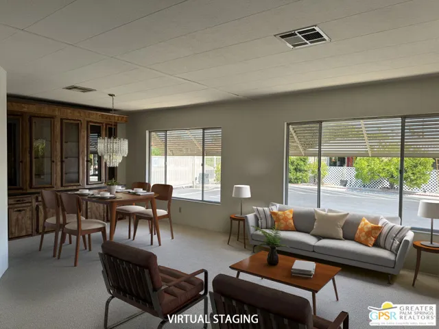Come see this home, one of the Larger Models in the park with Open Floor Plan. Enjoy land-owned 55+ living in wind-sheltered South Palm Springs at El Dorado Palms Estates. Situated on a prime corner lot, this 1,536 sq ft 2BD/2BA home features a formal living and dining room, a separate family room, and an updated kitchen with newer appliances. It offers a wraparound circular floor plan… rare layout where the kitchen, dining, living, and family rooms connect in a continuous loop. This open layout emphasizes ease of movement and is ideal for living in or entertaining. Bedrooms are oversized with walk-in closets. Flooring includes brand new plush carpet and laminate wood. Relax on patios with San Jacinto Mountain views. This home is in a prime location near the satellite pool, tennis/pickleball courts …and back gate allowing for easy entry and exit out of the community. HOA includes water, trash, Amenities of this community include gated security, clubhouse, pools, spa, suanas, exercise room, and aforementioned Tennis/Pickleball courts plus RV parking (small monthly fee for storage). Whether full-time or seasonal, this home is in one of the valley’s most sought-after 55+ neighborhoods and homes go fast.