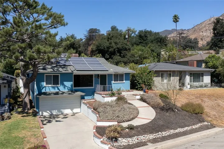 A wonderful spacious mid-century Altadena home situated in a beautiful neighborhood overlooking the tree lined Mount Lowe Park. City Views with a park-like setting all still fully intact. This special home features 2 bedrooms + Den that could be 3rd bedroom along with a bonus room perfect for in- home gym or office along with a bathroom and shower attached to subterranean double garage. There is also “owned” solar panels with huge monthly electrical savings. Other features of this property include, living room with great views and a fireplace, galley kitchen with newer appliances and dining area. Laundry room with fantastic built-in storage/pantry. Separated den with a large closet and built-ins with direct access to backyard. Large primary suite with dressing area with built-ins, sky light and a large primary bathroom with walk-in shower. Hard wood flooring throughout. Tankless water heater. Newer air conditioning and heating unit. Huge private backyard with spacious concrete patio for entertaining large gathernings along with second patio with built-in arroyo stones under beautiful mature trees. Come and see this great house.