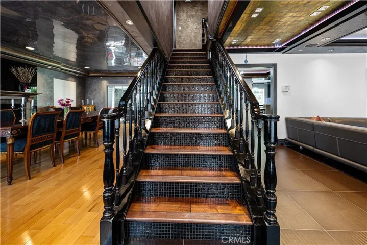 Step inside to a grand foyer leading to a formal dining room designed for unforgettable gatherings—seating up to 20 guests beneath an intricately detailed ceiling and a striking fireplace mantel. The living and family rooms provide generous space for entertaining, enhanced by elegant cove lighting throughout.