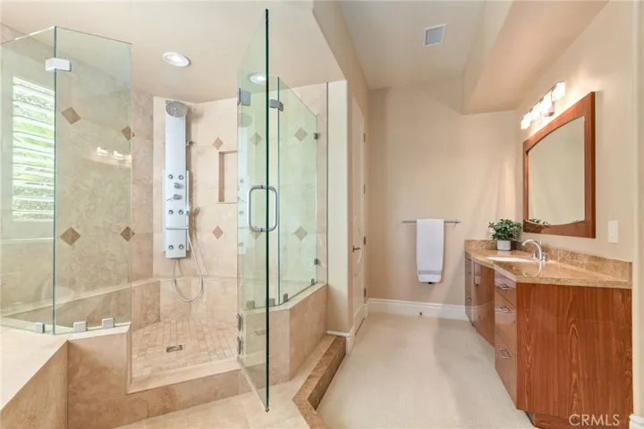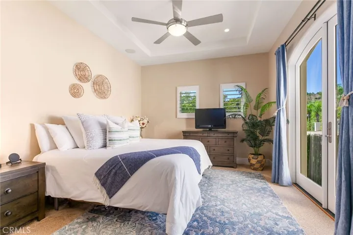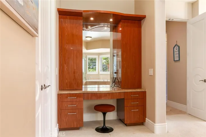 The interior features soaring 12-foot ceilings in the main living areas, a sunken bar with sink, refrigerator, and wine cooler, plus custom cabinetry throughout. The chef’s kitchen is equipped with a new built-in stainless steel KitchenAid refrigerator, dual Miele dishwashers, and a warming drawer. Electric retractable screens in the living and family rooms add comfort and convenience.