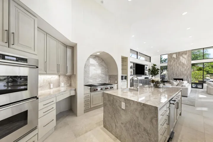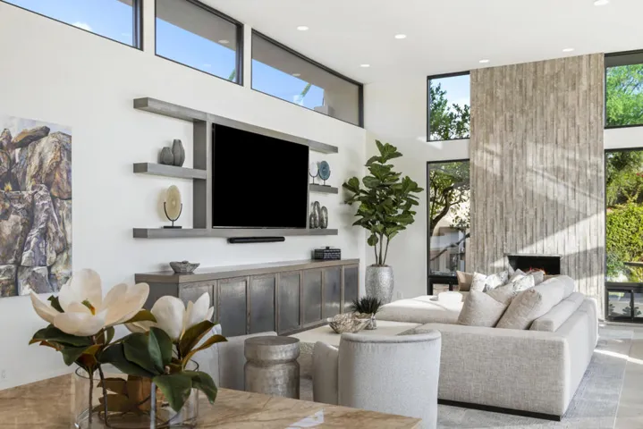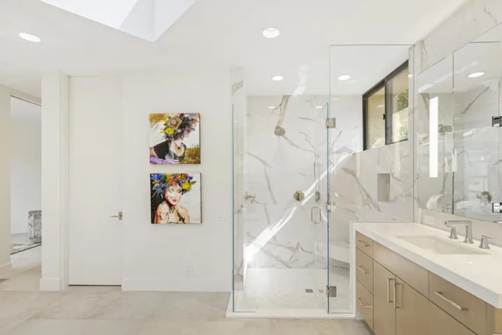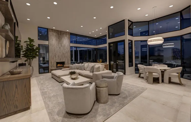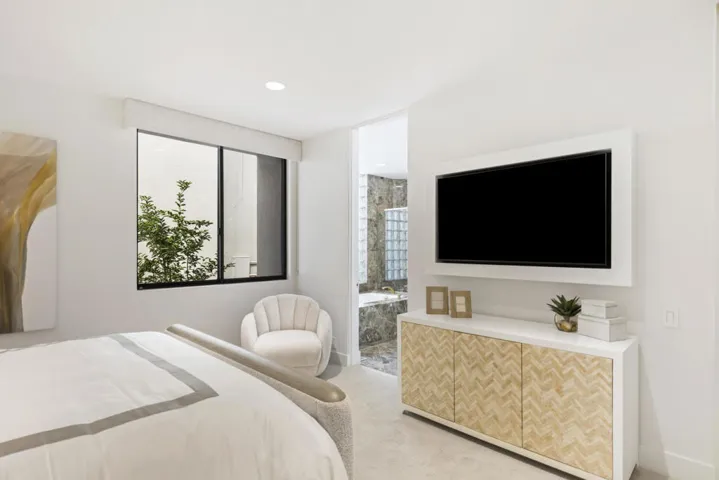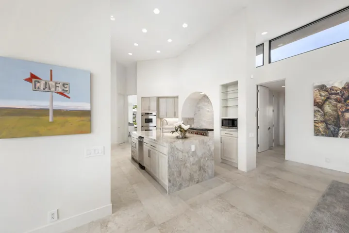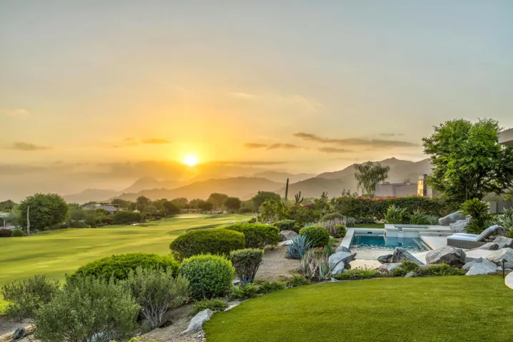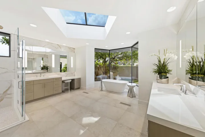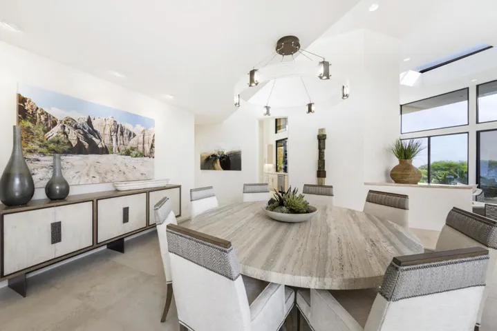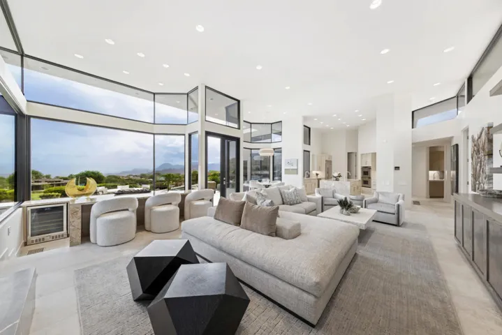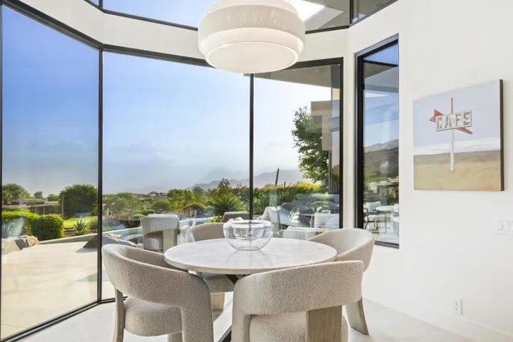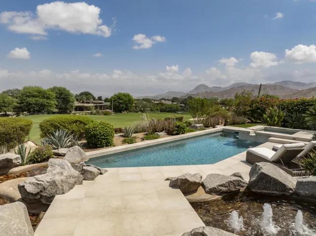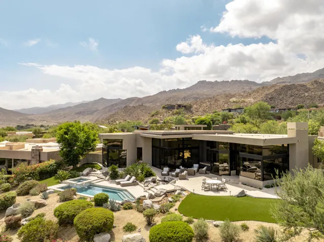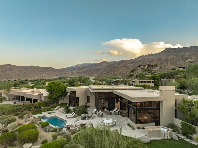 An iconic Guy Dreier design completely transformed by Easton Builders with interiors by Fedderly & Associates. Located in the prestigious Bighorn Golf Club, one of the desert’s most exclusive private clubs, this 5,400 sq ft home offers 4 bedrooms, 6 bathrooms, and commanding views of the 9th fairway, picturesque mountain ranges, and city lights from Bighorn’s Mountains Course. The primary suite features a private office with courtyard views, luxurious master bath, and newly remodeled steam bath capturing breathtaking vistas. Two interior guest suites occupy the opposite wing, plus a separate-entrance guest house for ultimate privacy. Soaring ceilings, floor-to-ceiling glass, and seamless indoor-outdoor flow create stunning living spaces throughout. Multiple outdoor entertaining areas include a pool and spa, built-in BBQ, reimagined river water feature, and firepit perfect for sunset gatherings. Essentially a brand-new home with stunning cosmetic upgrades, it also features a new roof, completely new plumbing, electrical, HVAC systems, pool equipment. Offered fully furnished and move-in ready.