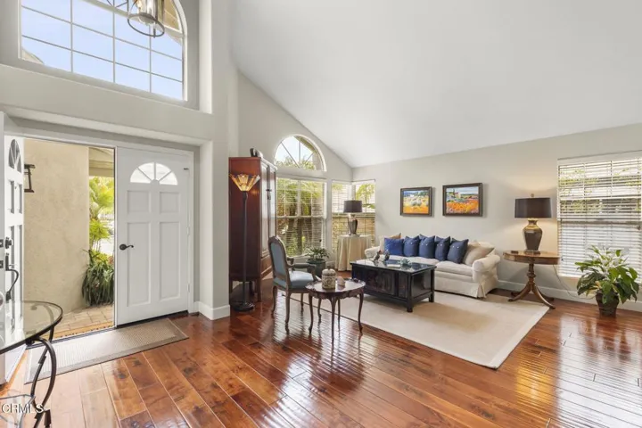 A Beautiful Custom remodel in prestigious Peter’s River Ridge Golf Community. This 4 BR, 3.5 bath, 2768 SF home combines elegant finishes & designer fixtures! Situated half way between Malibu & Santa Barbara – the coastal weather is fantastic! Entering thru the custom painted front double doors, take in the soaring ceilings, gorgeous walnut wood floors, custom metal & wood curved staircase & designer chandelier, bathed in natural light from numerous dual paned double hung windows. The original sunken living room floor was raised to create a large entertainment space which connects to the dining area. The elegant curved staircase leads to a large 2nd floor landing and 3 bedrooms. The large master suite has a double door entry, vaulted ceilings, dense wool carpet, separate walk-in closets w/ mirror doors, built-in cabinets & cedar lined shelving. The master bath features a 2 sink vanity, dual medicine cabinets w/ hidden thick glass shelving & are mirror lined w/ electrical plugs. The marble shower has 1/2′ thick Starlite glass. Enjoy the large soaking tub w/ hand-held filler & deck surround with a private tropical treetop view. The guest bedroom includes a walk-in closet & ensuite bath w/ separate vanity & shower rooms. The upstairs front bedroom/media room has a vaulted ceiling & built-in bookcase. The kitchen features high-end Viking & Thermador appliances, custom Alderwood cabinets w/ rollout drawers, granite counters, large pantry, Pentaire water filter at large dual sink under a window box w/ remote control shade & dining area. The family room’s custom designed travertine gas fireplace & recessed & art spot lights provide a relaxing view thru large windows to the lush private backyard. The 5 foot wide hallway leads from the family room past the large coat closet and storage to a powder room for guests. The 1st floor bedroom/office includes an ensuite full bath. The laundry room w/ cabinets & sink lead to the 3 car finished garage, with a coated floor, work bench & wall of build-in cabinets, a large softwater tank and new large water heater. Custom mature landscaping also includes pavers & flagstone, a wall fountain & a large Sunsetter automatic shade w/ lighting. Automatic sprinklers and landscape lighting is plumbed front and back. This home is in a prime location within walking distance to the pool, spa, tennis/pickle ball court & greenspace amenities. Shopping, golf & clubhouse, 2 harbors & beaches are minutes away.