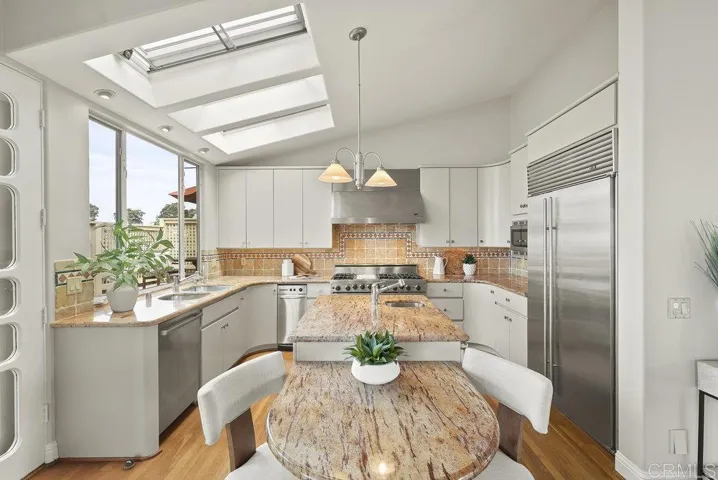 Location, Location, Location. Sweeping WHITE WATER ocean views from the living room, kitchen, and primary suite! Homes lives like a SINGLE STORY, with all living and primary bedroom space on same level as the street and garage. Two balconies to continue enjoying your views outside are also off of the living room. Two additional, large bedrooms and bathroom en-suites are downstairs with access to the backyard. Stunning garden with two spas ideally centered to take in more white water views of the ocean. Moments from the quaint village of Del Mar to enjoy restaurants, shopping and culture. Grab your beach toys and head down for for a day at the beach. This home provides the lifestyle you’ve been dreaming of!