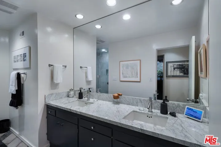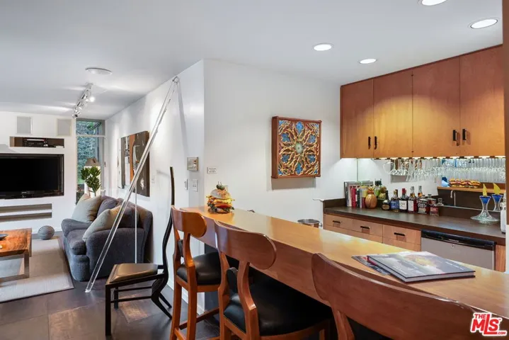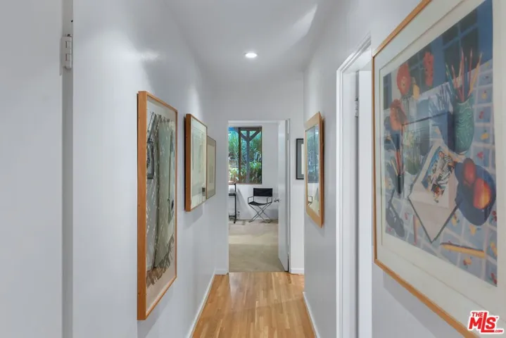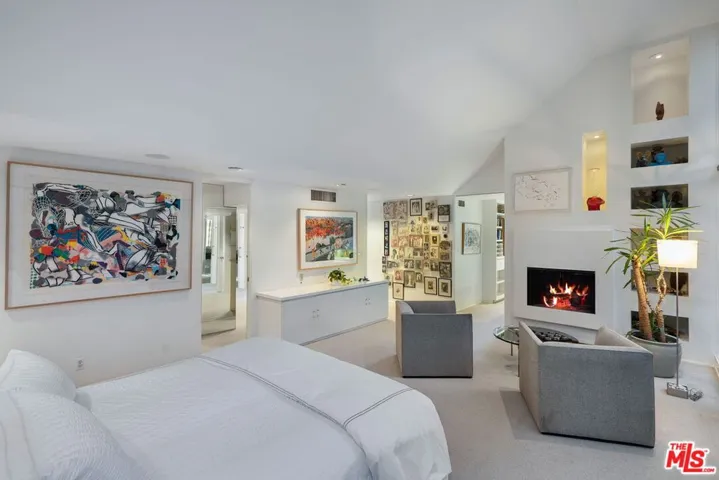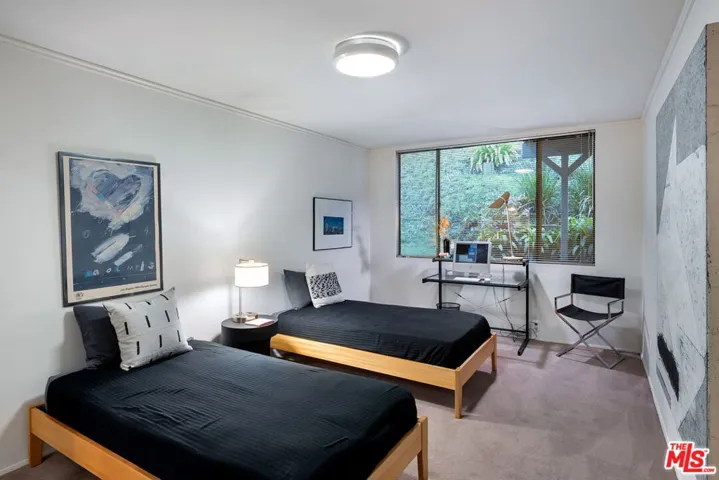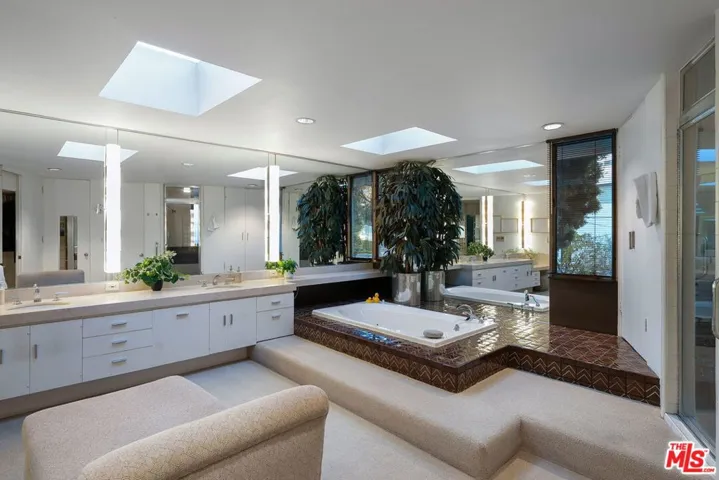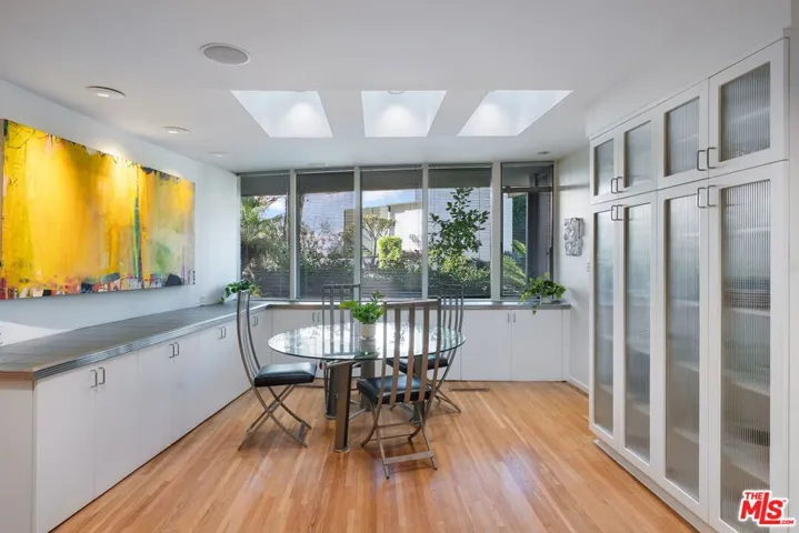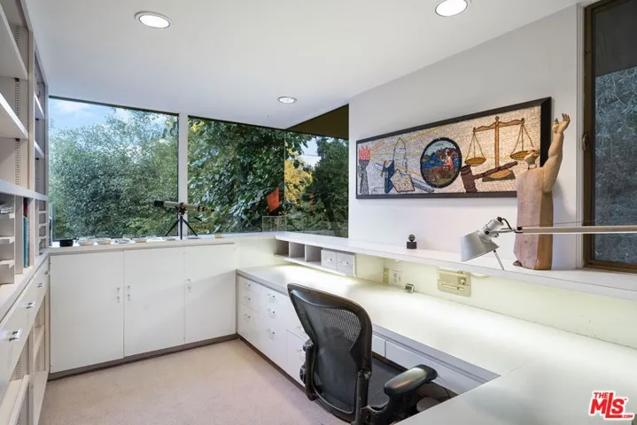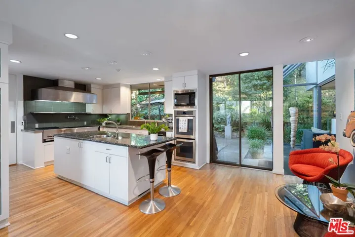 This stunning architectural residence by architects Benton and Park blends modern design with timeless elegance in the heart of Brentwood. Offering 4 bedrooms and 4 bathrooms, this home is filled with natural light and verdant green backyard views from floor-to-ceiling windows and skylights, creating seamless indoor-outdoor living. The upstairs private primary suite is a true retreat, complete with a sun deck, two large walk-in closets, and a spa-like bathroom. Designed for both work and leisure, the home includes two private offices, a family room with wet bar, a striking solarium, and conditioned wine storage. The chef’s kitchen features professional-grade stainless appliances, an eat-in dining area, and an effortless flow to the center hall and living spaces. A dedicated laundry room and two-car garage add everyday convenience. Step outside to a lushly landscaped backyard oasis with a pool, waterfall, and hot tub, perfect for relaxation and entertaining. Central heating and air conditioning ensure year-round comfort. This is more than a home it’s a rare architectural jewel offering style, comfort, and timeless sophistication in one of Los Angeles’ most coveted neighborhoods, in a rare and quiet cul-de-sac location.