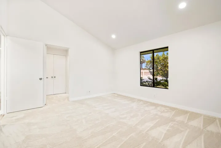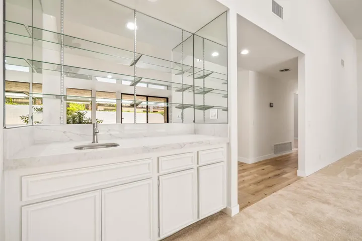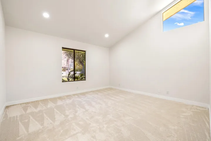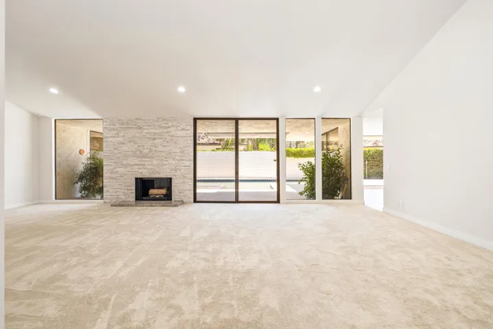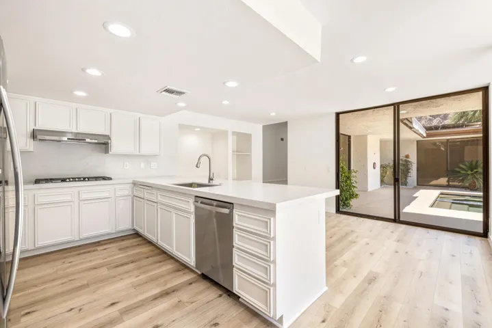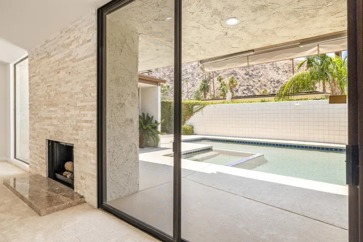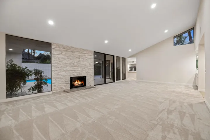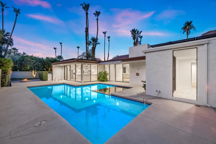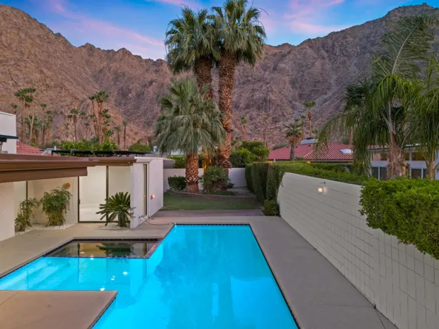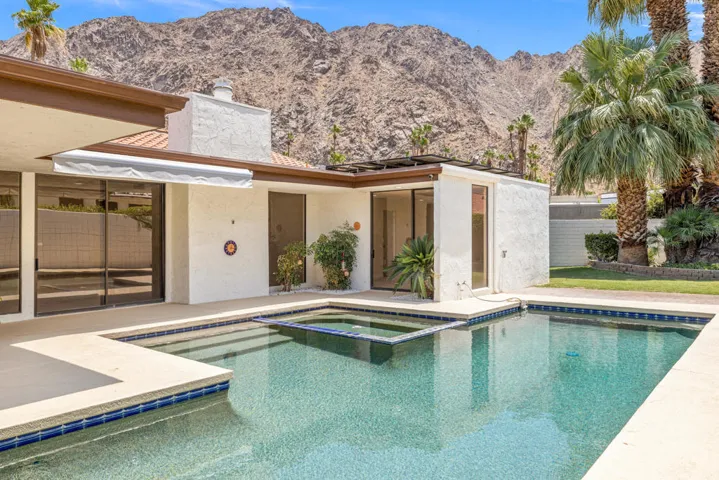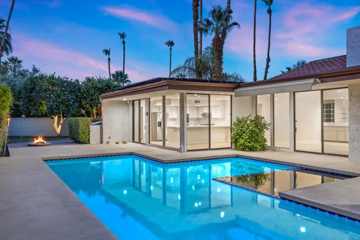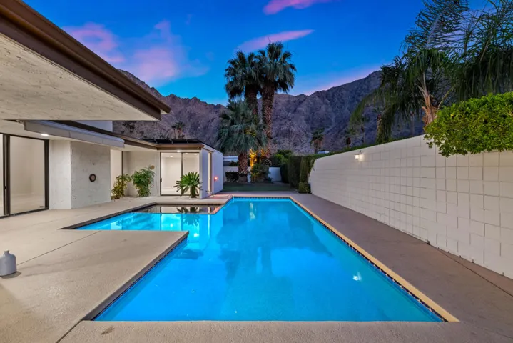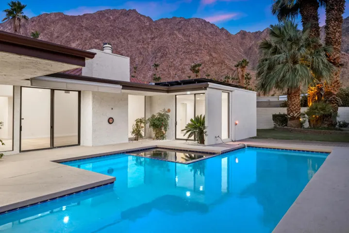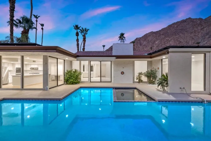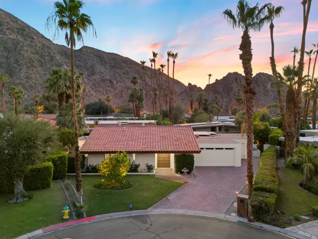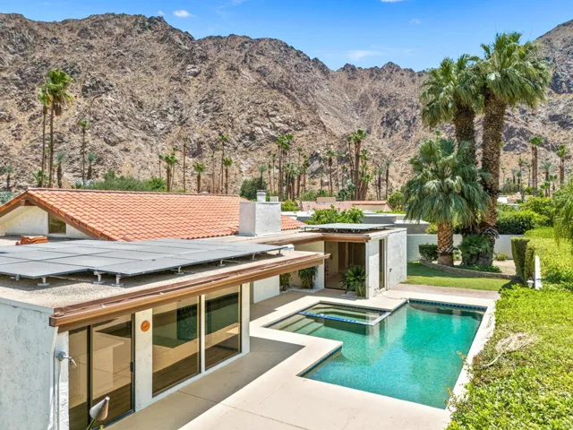 Beautiful and just remodeled mid-century modern home nestled within highly sought after Manitou Springs community at prestigious Indian Wells Country Club. Relax in the scenic backyard with breathtaking mountain views, pebble tech pool/spa and yard with lush flowers, palm and citrus trees. Home features 2 bedrooms, 2 ensuite baths, Powder Bath, 2260 Sq. ft interior living space, 2 cars plus golf cart garage, built in 1978. Home has seller owned solar energy for efficiency. Fabulous location on quiet cul-de-sac with pavered driveway and walkway. All new interior white painted walls and baseboards, new luxury vinyl wood plank floors throughout with neutral carpets in bedrooms and the Great Room, and new quartz countertops. Stunning entry into the open Great Room with high ceilings, sparkling pool and mountain views, walls of glass, and floor to ceiling new stone gas fireplace with onyx hearth. The Great Room has Wet bar with glass shelving. The open Kitchen includes all new stainless appliances, and gorgeous new quartz countertops with full backsplash, and ample bar seating. Adjacent to Kitchen boasting views galore, is a built-in desk with storage shelves so could be used as home office, or informal seating or dining area. Primary Bedroom has glass sliders out to covered patio. Spacious Primary Bath has new dual sinks, quartz countertops, a big shower and walk-in closet. Guest Bedroom has walk-in closet and new glass shower. Not to be missed this mid-century modern home tucked into guard-gated IWCC, and so close to world class shopping, golf, and the famous Tennis Gardens. Low HOA’s!