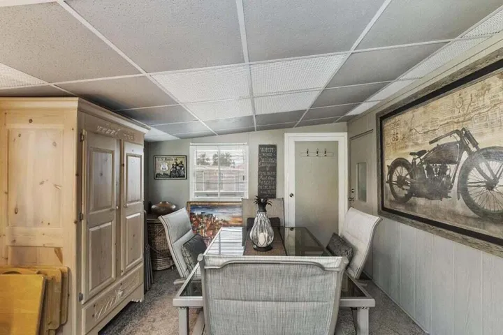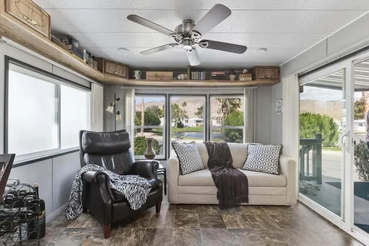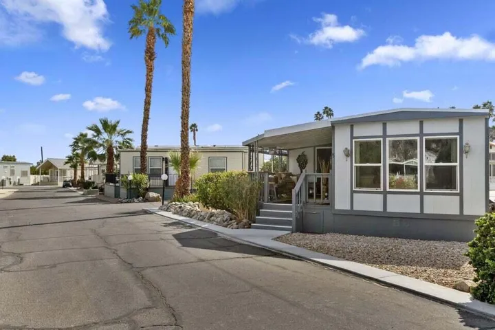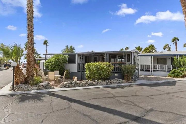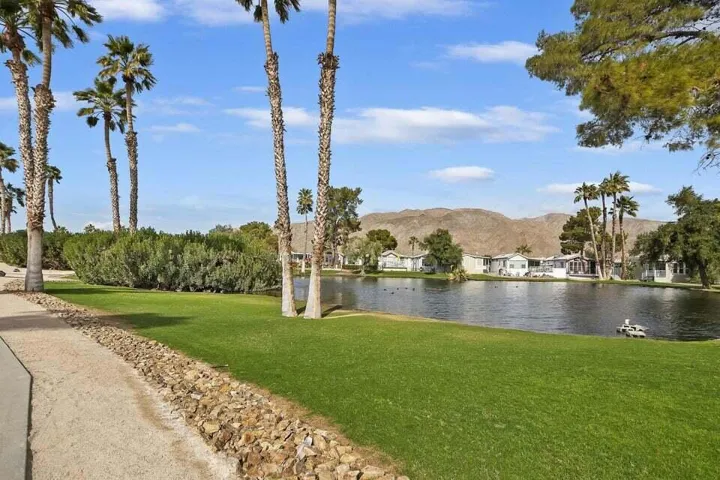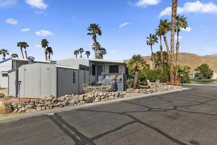 Welcome to Family Friendly ‘Sky Valley Resort’ This DMV registered Park Model is located on a huge corner lot with a beautiful lake and majestic mountain views. The lake view is spectacular in the evening with all of the lights as well as, during the day. Located just 1 block from the west side resort facilities. The same seasonal owners for 19 years, so no pets, no renters. Tastefully furnished (minus a few items) The California room that can be used for many venues to suit your needs. Ample storage inside the house and also with the over-sized shed. There is an amazing view of the lake from the living room, kitchen and porches. There are 2 porches and 3 additional outside spaces for entertaining, 2 parking spaces and enough room in the front yard to add a 3rd parking space. There is a new washer/dryer combo in the shed and an additional refrigerator. The shed is oversized and is very functional. New hot water tank, new furnace thermostat, recent service on LP line to the home, recent interior/exterior paint, new toilet and sink taps, diamond plate vanity, newer double insulated roof coat, new frosted privacy windows in the living area, newer flooring and carpet, new sub-floor on the deck and house. Enjoy freshly picked pink grapefruit and lemons from your own trees! This home lacks nothing and is immaculate! Enjoy the RARE and healing mineral water in the pools and spas, pickleball, tennis, open Desert hiking and beautiful lifestyle of Sky Valley Resort. The Desert has so much to offer! Warm Winters, PGA golf tournaments, music festivals, art festivals, Acrisure Arena, fine dining and shopping on El paseo or quaint Palm Springs! Perfect permanent home or warm Winter Getaway! No property taxes and a low monthly space rent of 920.00 per month!