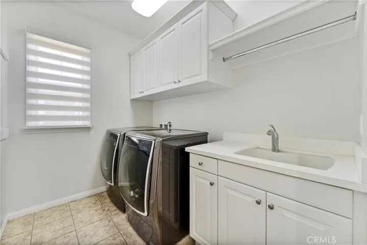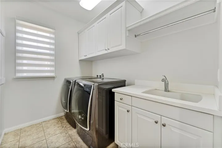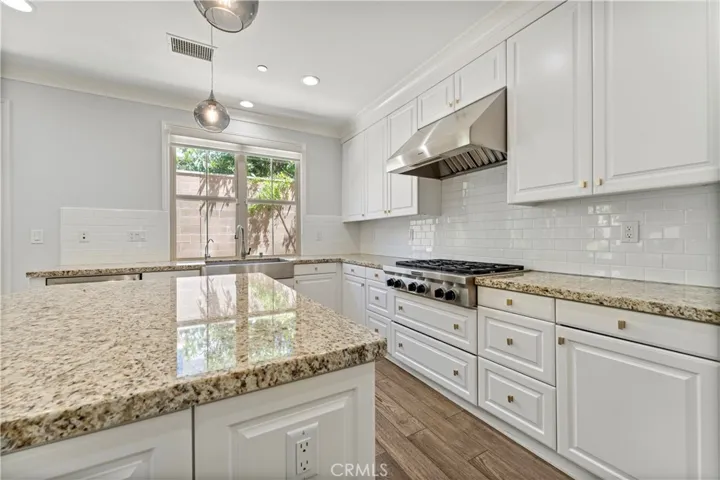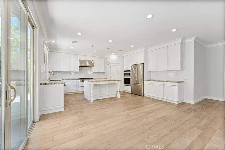 The spacious kitchen is a true centerpiece, featuring granite countertops, white shaker cabinets, stainless steel appliances, and a large island perfect for entertaining. It flows seamlessly into the living and dining areas with direct access to the professionally landscaped backyard, complete with pavers, an and arbor.