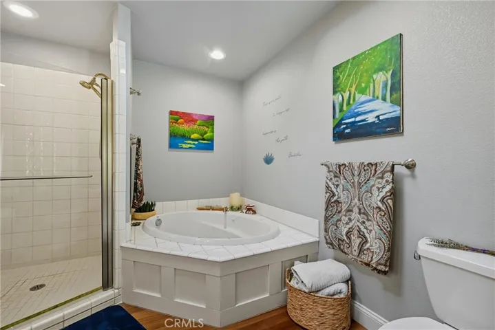 The kitchen features Corian counters, stainless steel appliances, and an abundance of cabinets for storage. The spacious primary suite opens directly to the backyard, complete with a walk-in closet and a bathroom designed with both a soaking tub and shower.