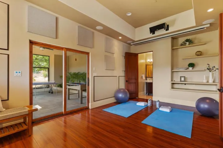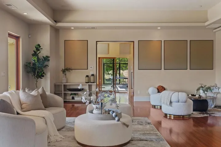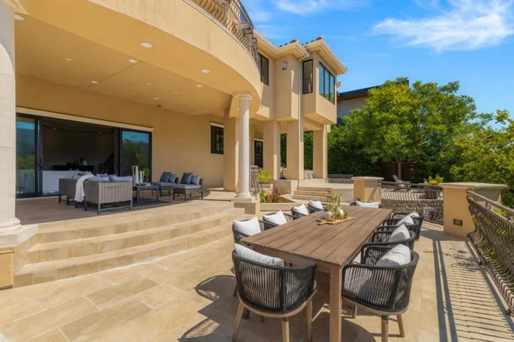Custom-built Mediterranean-inspired estate (2011) offering panoramic Monte Bello views from each level. Nestled on a quiet cul-de-sac, this 5,693 sq ft residence combines timeless charm with modern luxury. Features include a chefs kitchen with Thermador appliances and RO filtration, a home theatre/game room with acoustic wall panels, and indoor/outdoor surround sound throughout. The home starts with serene entry with colorful garden beds, greenery and water fountain. An open family room and kitchen that opens to expansive decks with sweeping vistas. Thoughtfully designed for wellness and multi-generational living, the main floor hosts three en-suite bedrooms, while the lower level includes two additional bedrooms, a family/media room with its own large patio, and dedicated wine-closet space awaiting your personal touch. Eco-friendly amenities abound including owned solar panels, dual EV chargers, soft-water and carbon filtration systems, whole-home HRV for fresh air, and interior fire sprinklers. Incredible Views and only minutes from downtown Los Altos, premier schools, and I-280 access.