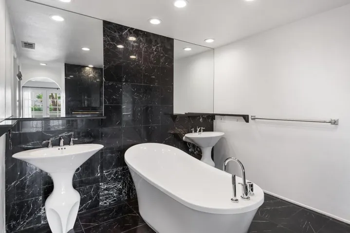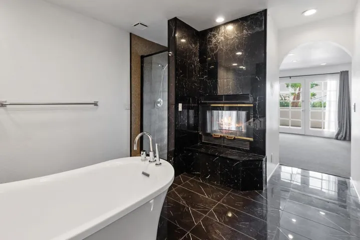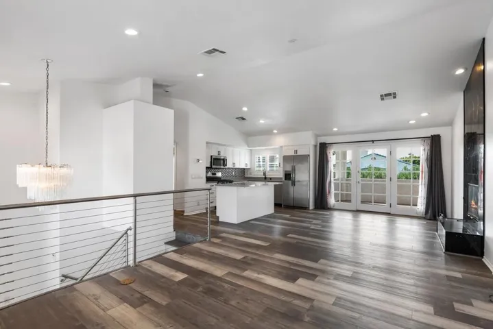 Stunning split level pool home offers great curb appeal with fully gated front yard and driveway, and low maintenance rockscape and cactus landscaping. The interior features vaulted ceilings with recessed lights, plank floors in the main living areas, 2 primary bedrooms, and many upgrades throughout including a new A/C unit in 2024. The formal entry has a gorgeous chandelier, take the staircase up to the main floor with spacious living room with fireplace and updated kitchen offering white cabinetry, stainless steel appliances, tile backsplash, and a center island with bar seating. There is a balcony with views of the backyard and pool. The primary suite is also located on the 2nd floor and also offers a private balcony, a 2-way fireplace and a spa-like ensuite with fireplace, 2 pedestal sinks, a soaking tub, and a walk-in closet with built-in storage. Downstairs you will find a bonus room with a kitchenette – great for guests or hosting parties, there is a fireplace, a private covered patio, a full-size bathroom, the laundry room, plus 2 more bedrooms with 1 bedroom including a private ensuite. The gorgeous backyard is like your own private resort with in-ground pool and spa, turf grass, covered pergola, palm trees, lush privacy hedge, and new landscape lighting installed in 2024! There is also an attached, insulated, 2-car garage with A/C! Located on a large corner lot, and no HOA fees, schedule your private tour today!