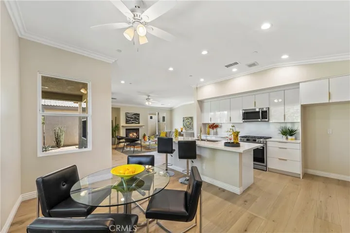 The stunning kitchen includes quartz counters and stainless appliances. The living areas are designed for entertaining, with the large windows capturing the breathtaking golf course and mountain views.