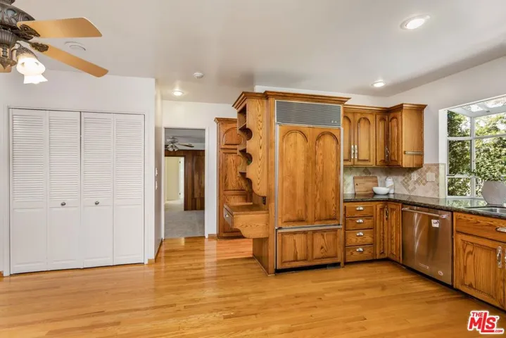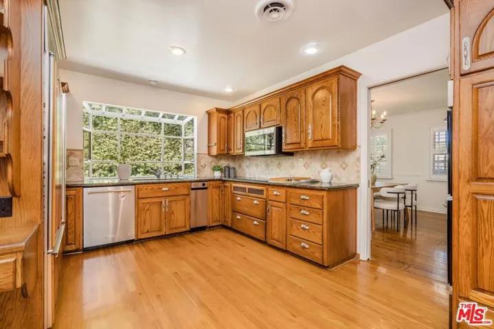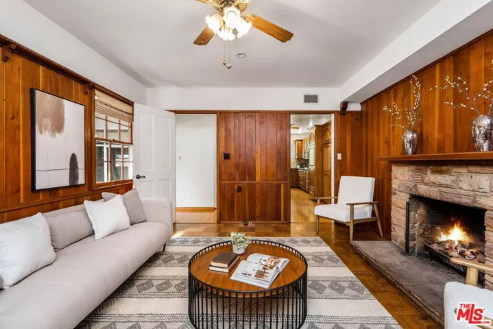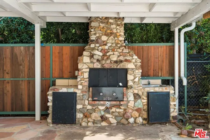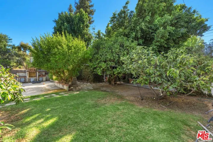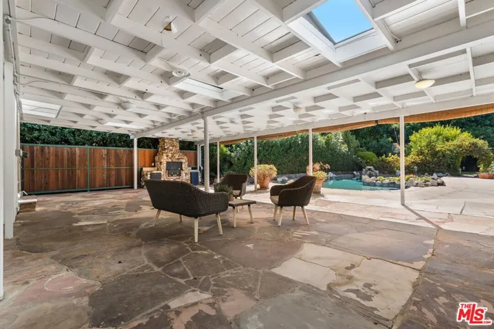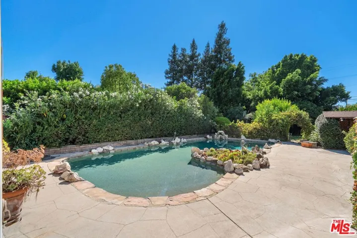 Set on one of Los Angeles’ most filmed and picturesque streets, this timeless traditional residence in the sought-after Cameron Woods neighborhood pairs classic charm with expansive living spaces and an entertainer’s dream backyard. This single-story estate offers 4BD/2.5BA across a thoughtfully designed floor plan, filled with natural light and warm hardwood floors. The expansive living room welcomes you with a marble fireplace and seamlessly connects to a dining nook with custom built-ins and charming windows. The well-appointed kitchen features a Miele electric cooktop, Sub-Zero refrigerator, and generous counter and cabinet space, complemented by a conveniently located powder room and direct access to the backyard. A versatile bonus living space with rich wood paneling and a second fireplace creates the perfect retreat for a cozy office or family room. Bedrooms are smartly arranged on opposite wings of the home, with the primary suite offering multiple walk-in closets and private access to the patio. A classic entertainment room with a vintage bar, brand new carpeting, and easy outdoor flow further enhances the home’s appeal. The backyard is a true private oasis, complete with a covered lanai overlooking a sparkling pool, a built-in stone BBQ, and a detached studio ideal for an office, creative space, or additional storage. The expansive grounds also provide excellent potential for an ADU. Additional highlights include a gated two-car carport and a fully paid, value-enhancing, and money-saving solar energy system. Beyond its charm and functionality, the property also presents unique income potential through film production opportunities. Perfectly situated with convenient access to the 101 and 405 freeways and just moments away from Sherman Oaks Galleria, Costco, and premier dining in Sherman Oaks, this rare offering blends suburban tranquility with city connectivity.