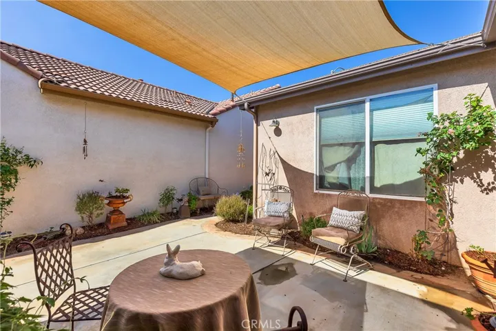 Welcome to Four Seasons at Hemet, a premier 55+ guard gated communities offering resort-style living and an active lifestyle. With exceptional amenities centered around The Lodge—which includes a bistro, fitness center, movie theater, arts and crafts studio, and more. Whether you prefer tennis, pickleball, bocce ball, aqua aerobics, or relaxing in the spa, this community delivers the perfect blend of recreation and relaxation. The open floorplan features 9-foot ceilings, crown molding, Solid Core Doors. Tile & Vinyl flooring, enhancing its clean, move-in ready appeal. Approach the home through a gated courtyard—ideal for peaceful mornings or evenings. The spacious kitchen offers Quartz countertops, a center island, and a unique glass block feature above the sink that invites natural light while ensuring privacy. The kitchen is perfect for everyday living and entertaining. A bright breakfast nook opens to the dining and family rooms, creating a welcoming atmosphere. Two bedrooms are positioned at opposite ends of the home for maximum privacy. The ensuite primary bedroom includes a walk-in closet, granite countertops, and a walk-in shower. The secondary bedroom is versatile for guests, a home office, or a hobby room. Additional features include energy-efficient vinyl windows, an electric fireplace, the garage has ample storage. All appliances are included—from the kitchen suite to the GE washer and dryer. Don’t miss your chance to live in one of Hemet’s most sought-after 55+ neighborhoods—schedule your showing today!