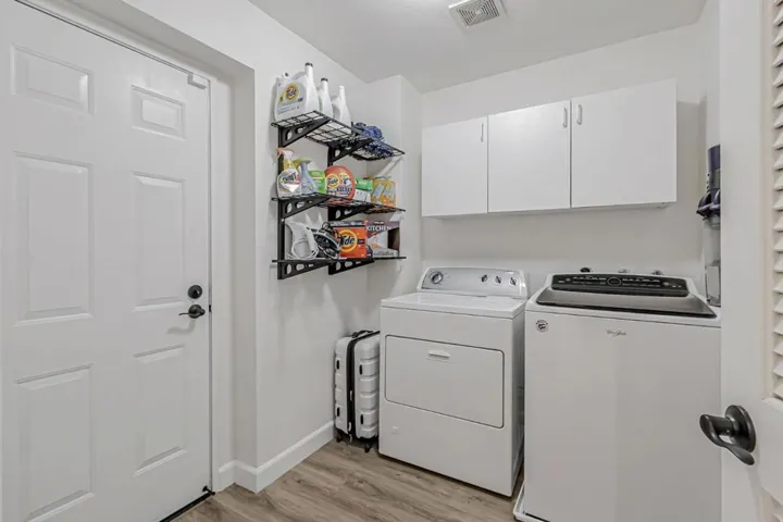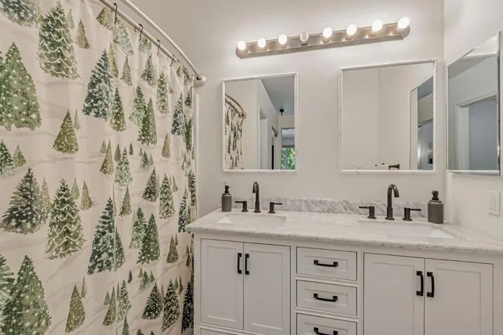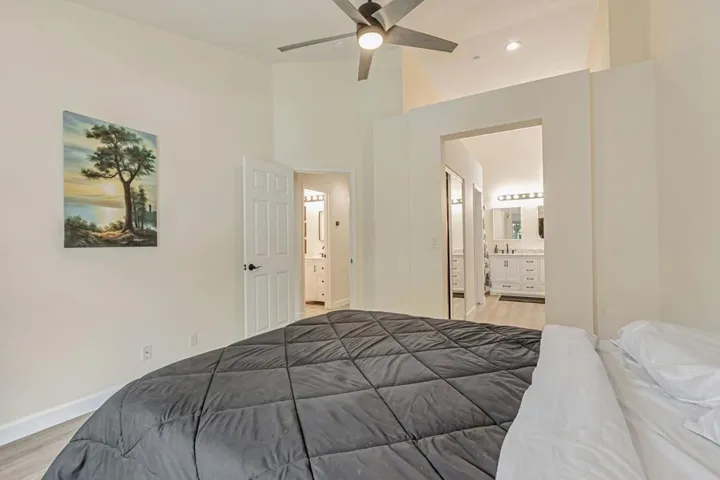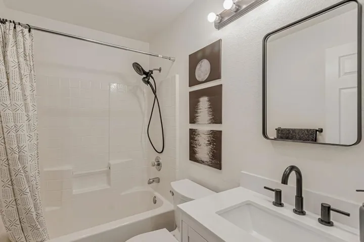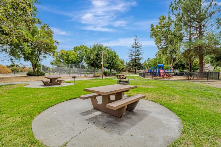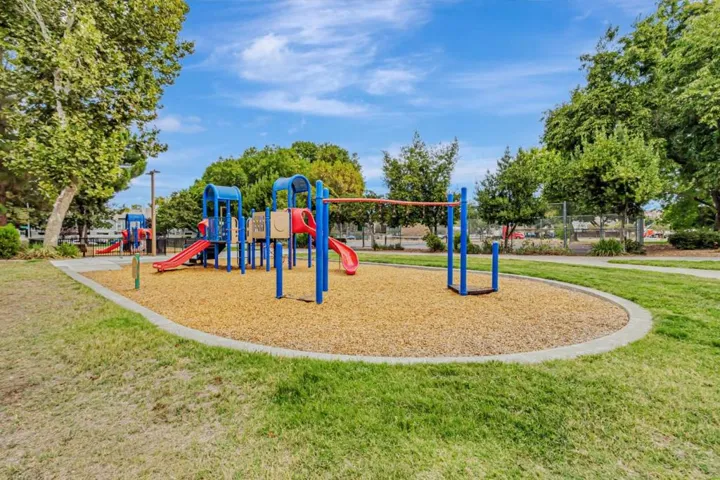 This townhouse-style condo features a bright kitchen with stainless steel appliances, granite countertops, a large sink with touch-sensor faucet (2023), recessed lighting, & sliding glass door (2023) that opens to a private patio. The kitchen flows into the dining area & living room, featuring a gas fireplace with mantle & ceiling fan. The vaulted-ceiling primary bedroom offers a ceiling fan & two mirrored closets with custom built-in dressers, shelving, & open storage space above them, along with an ensuite bathroom with dual sinks & a shower-over-tub. The second bedroom includes a ceiling fan & customized closet organizer. All three bathrooms feature updated vanities (2023), mirrors (2022), & toilets (2022). Upgrades include double-pane windows & blinds (2023), luxury vinyl plank flooring (2022), a Nest thermostat with ductwork improvements (2023), updated hardware, a dedicated laundry room, alarm system, electronic front door keypad, & a front screen door (2025). The attached garage features a new garage door (2023) & custom retractable screen (2023), plus an assigned parking space. Community amenities include a pool, basketball & volleyball courts, with Miyuki Dog Park & Kaiser Hospital nearby. Close to Cottle Light Rail Station & highways 85 & 101 for easy commuting.